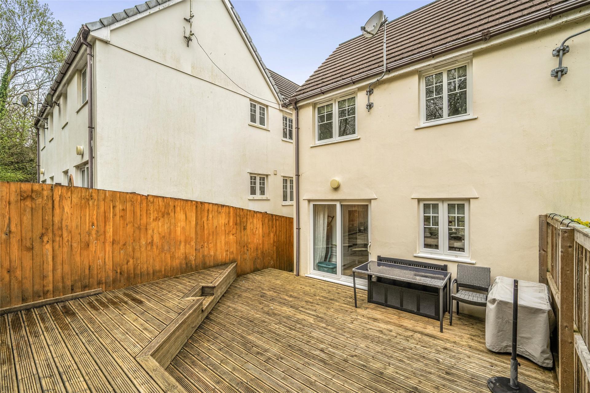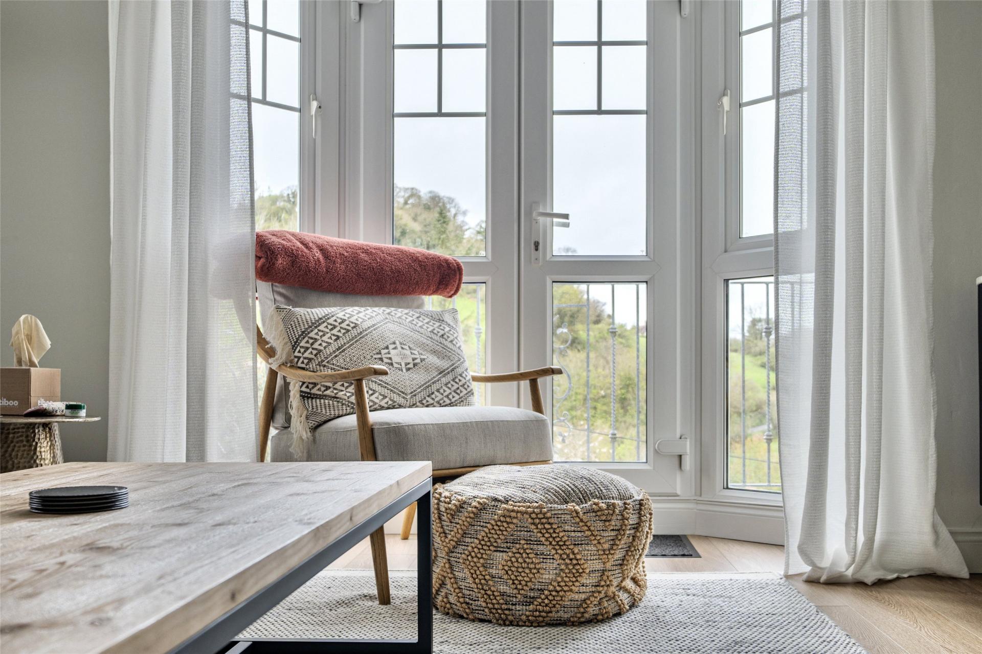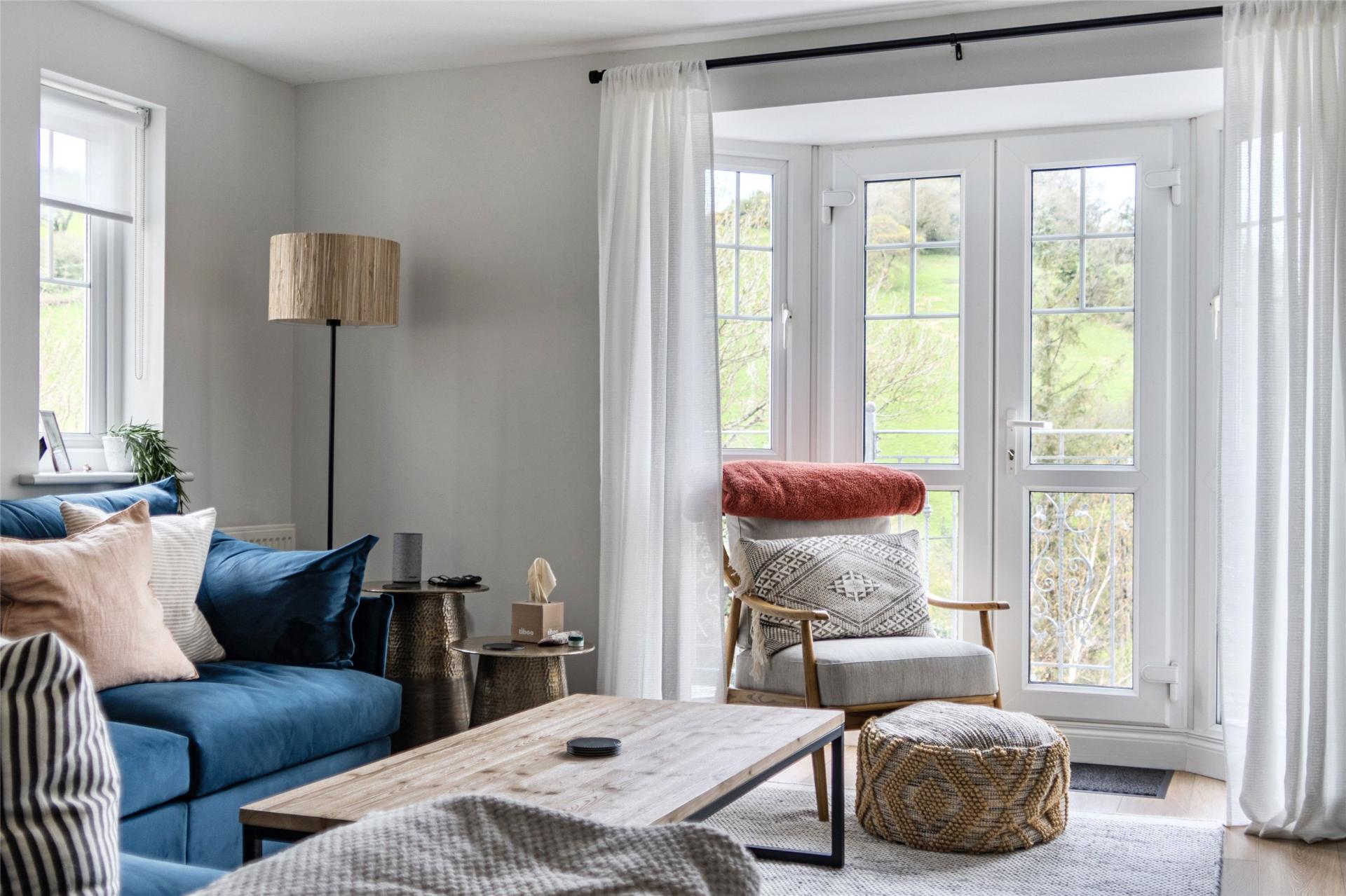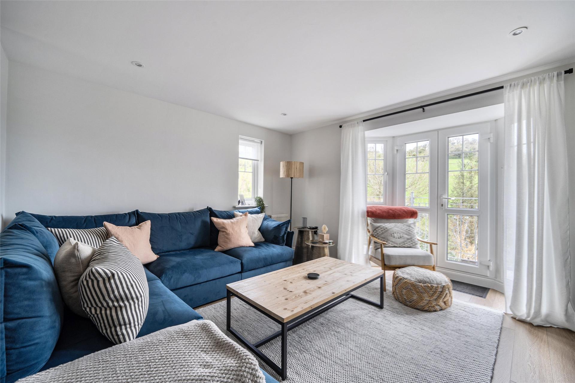 The accommodation is thoughtfully arranged to provide well-balanced and flexible living space, ideal for both family life and entertaining. The first floor forms the heart of the home, featuring an impressive open-plan kitchen, dining and living area. The stylish kitchen is fitted with a comprehensive range of high-quality units and integrated appliances, while the generous lounge area comfortably accommodates substantial furnishings. From here, doors open onto a spacious balcony—an ideal vantage point from which to enjoy the stunning sea and countryside views. To the rear, the dining area provides direct access to a low-maintenance garden, perfect for outdoor dining and relaxation.