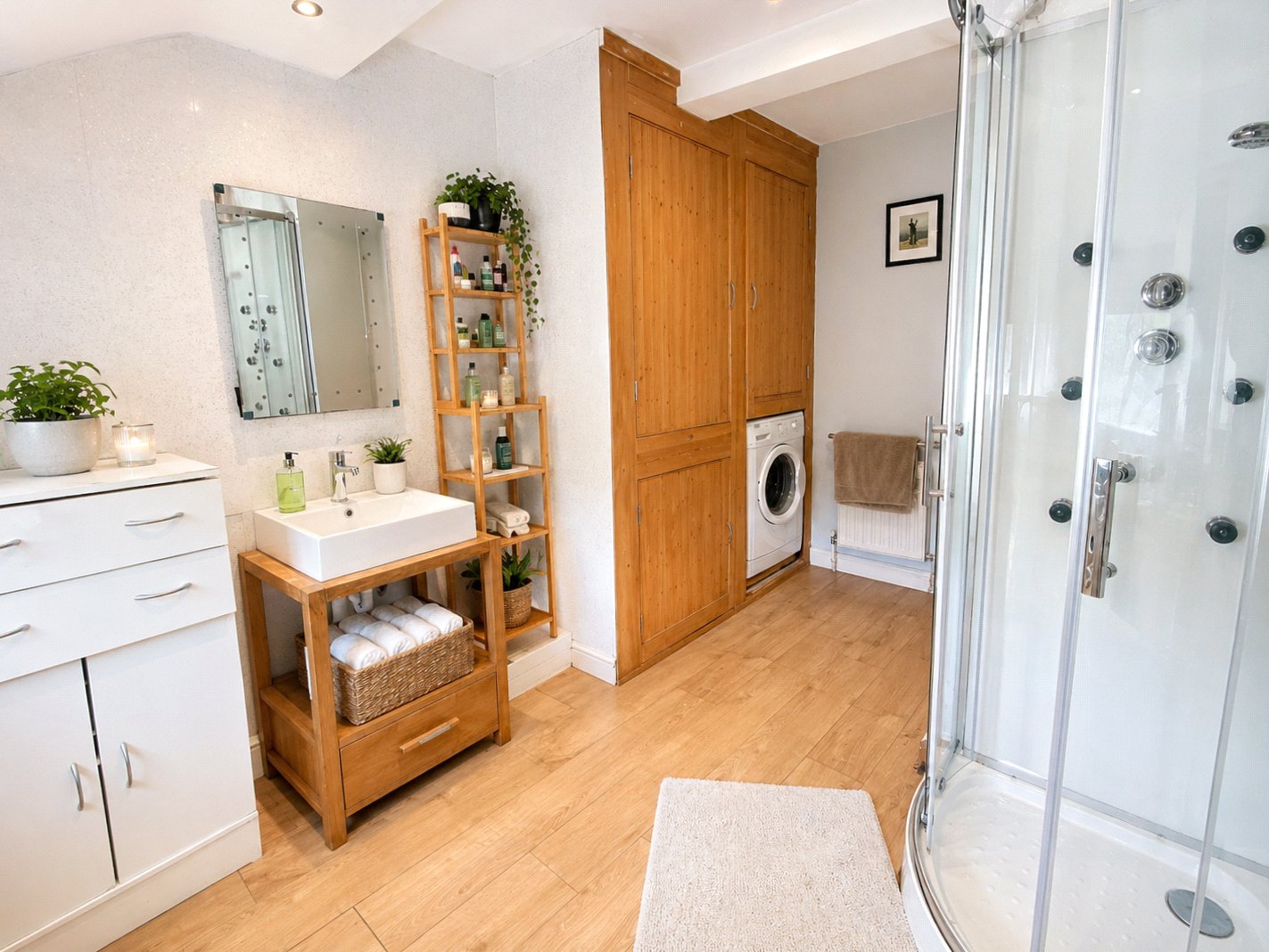 Also on the ground floor is a three-piece bathroom, comprising a corner bath, separate shower enclosure, low-level WC and wash hand basin set into a vanity-style unit.