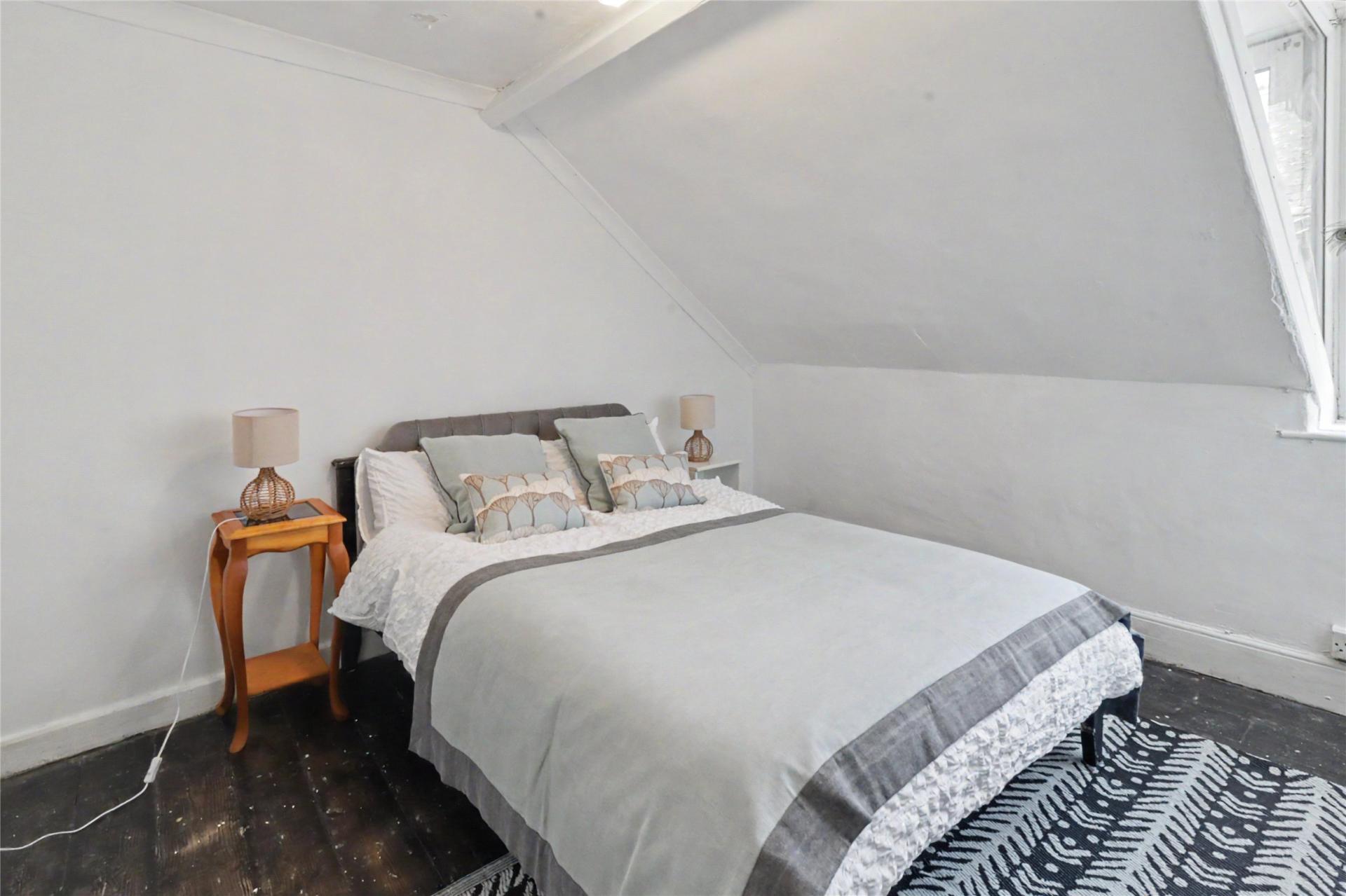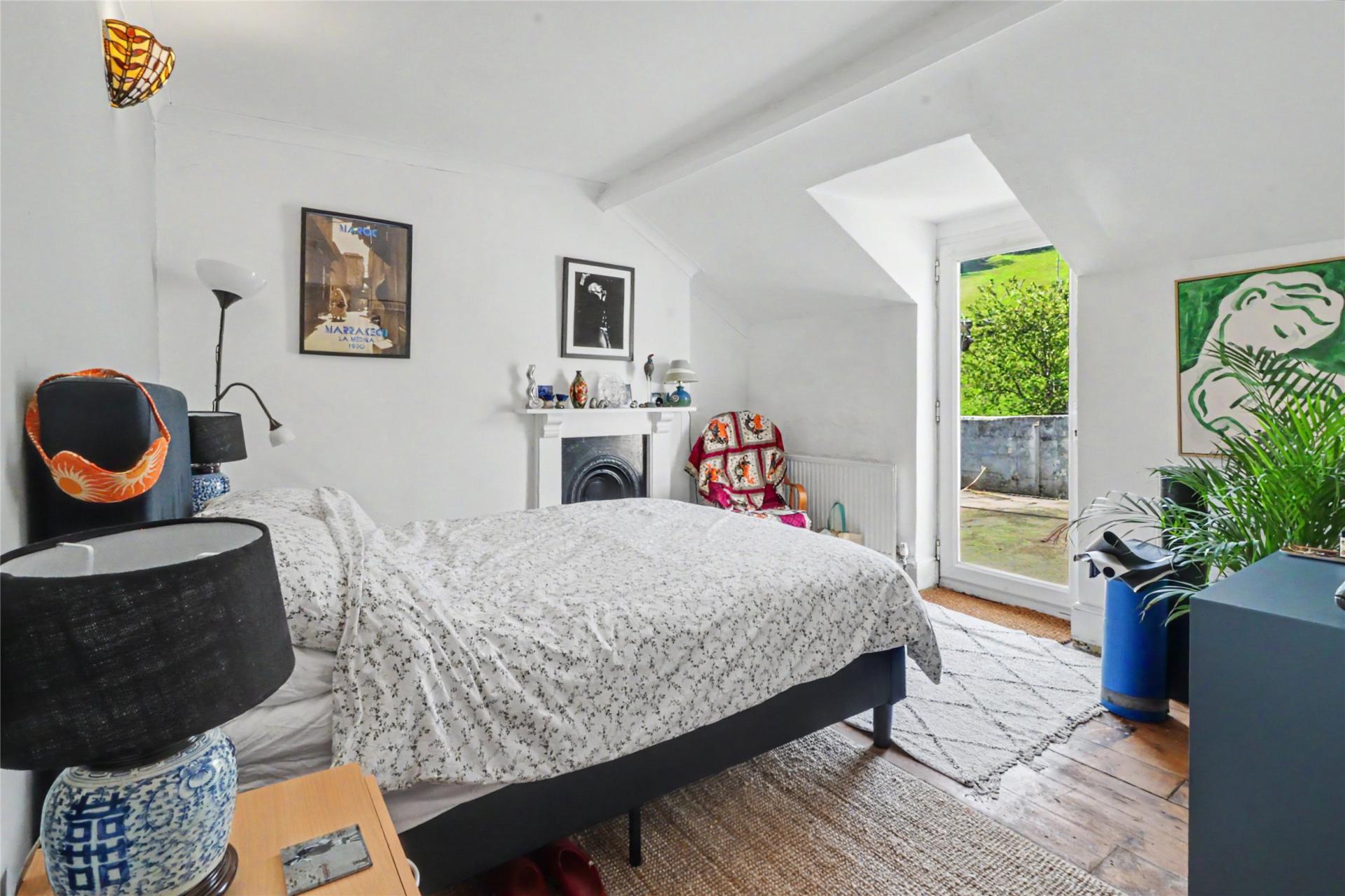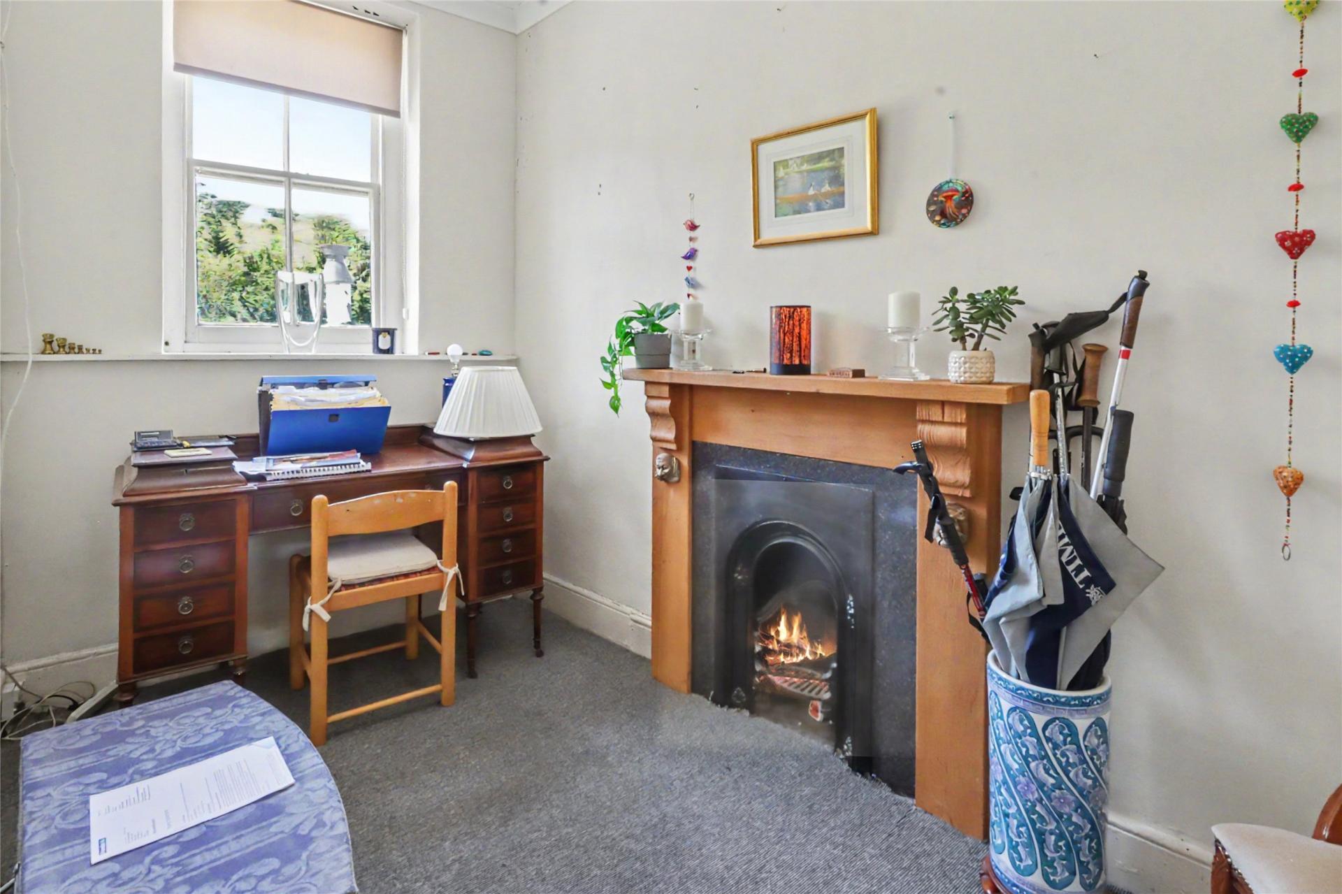 On the half landing, there is an additional sitting room or bedroom, complete with a feature cast iron fireplace. This room enjoys access onto a fully enclosed south-facing sun terrace, which provides a sunny outdoor seating area with views across the surrounding countryside.