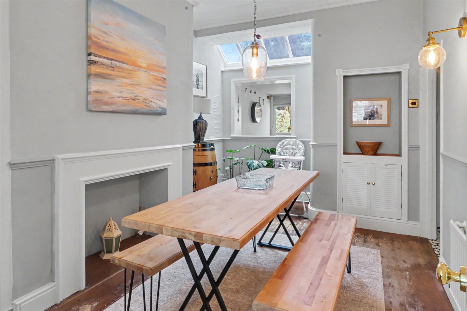 The property offers spacious and well-presented accommodation arranged over three floors, providing a versatile and comfortable living space suited to a growing family, a relaxed retirement, or a wonderful holiday retreat by the sea. Upon entering the house, a welcoming entrance hall leads into a larger main hallway, from which the principal reception rooms and kitchen can be accessed. To the front of the property, the sitting room is a light-filled and inviting space, enhanced by high ceilings Victorian roses and cornicing and a broad bay window that allows natural light to pour in coupled with an ecolog burner, creating a warm and homely atmosphere. Adjacent to the sitting room, the dining room offers an ideal setting for entertaining and family meals, featuring a useful serving hatch through to the kitchen.