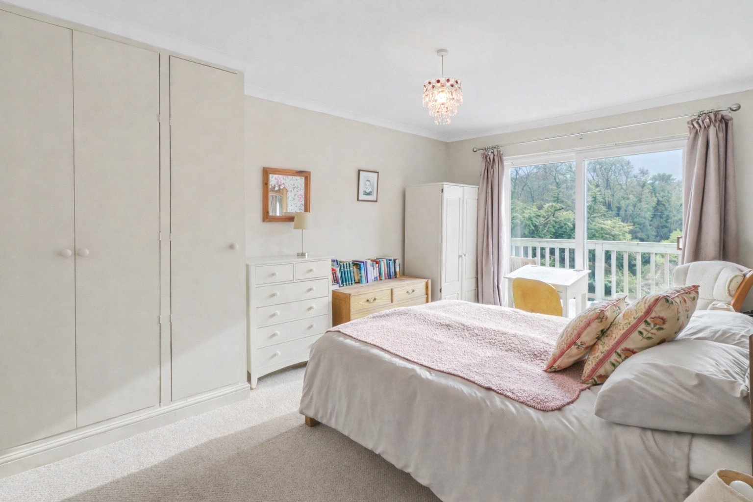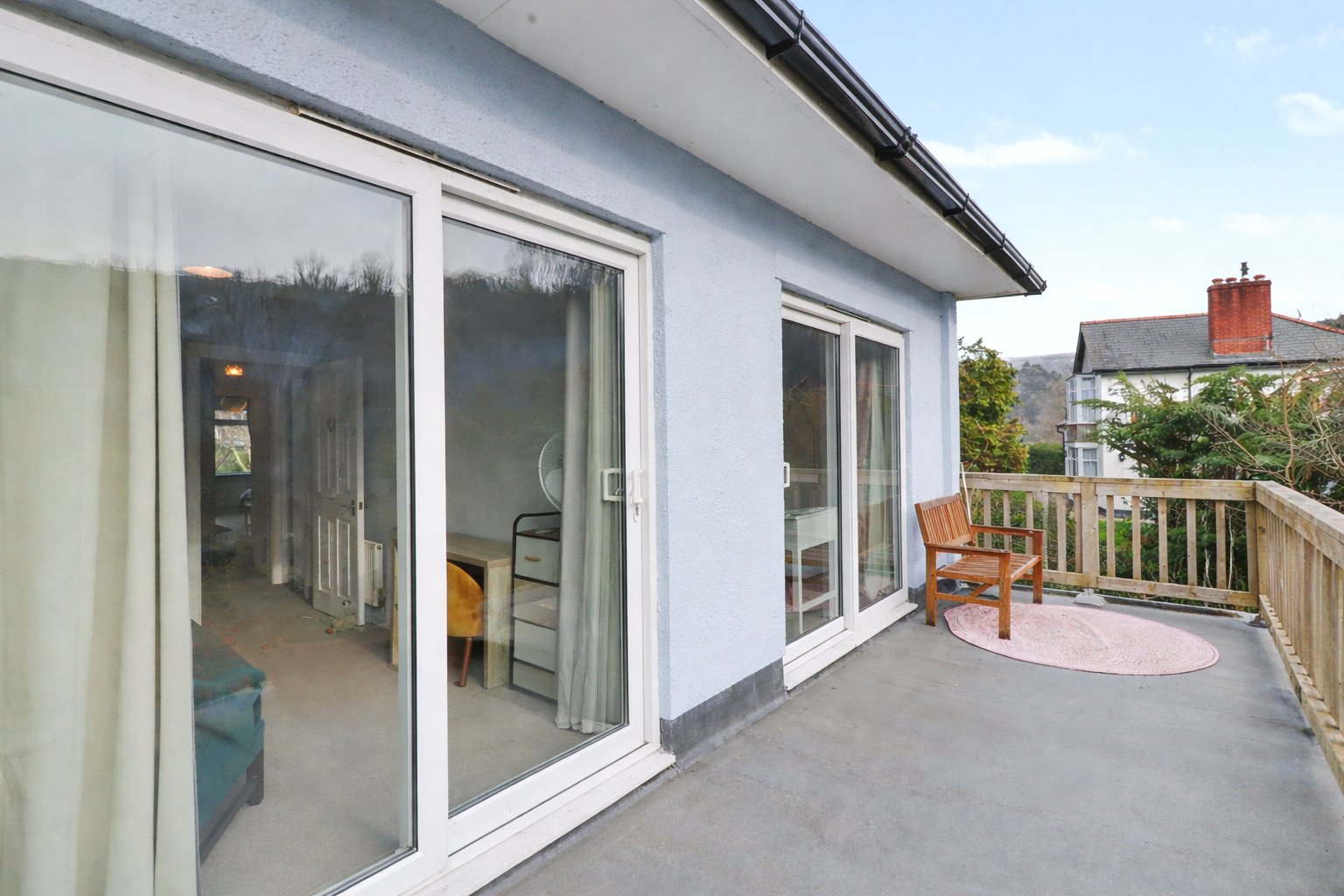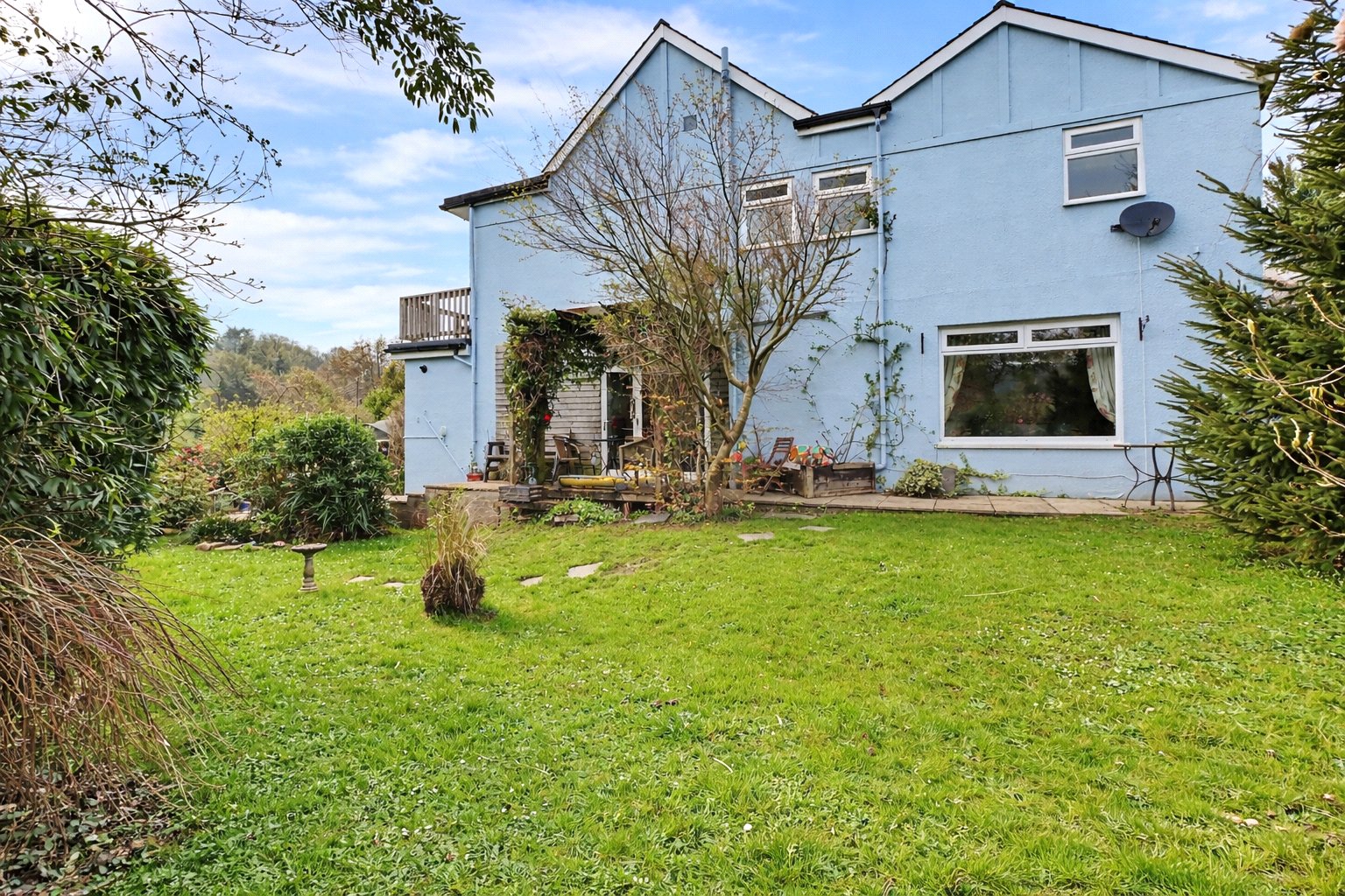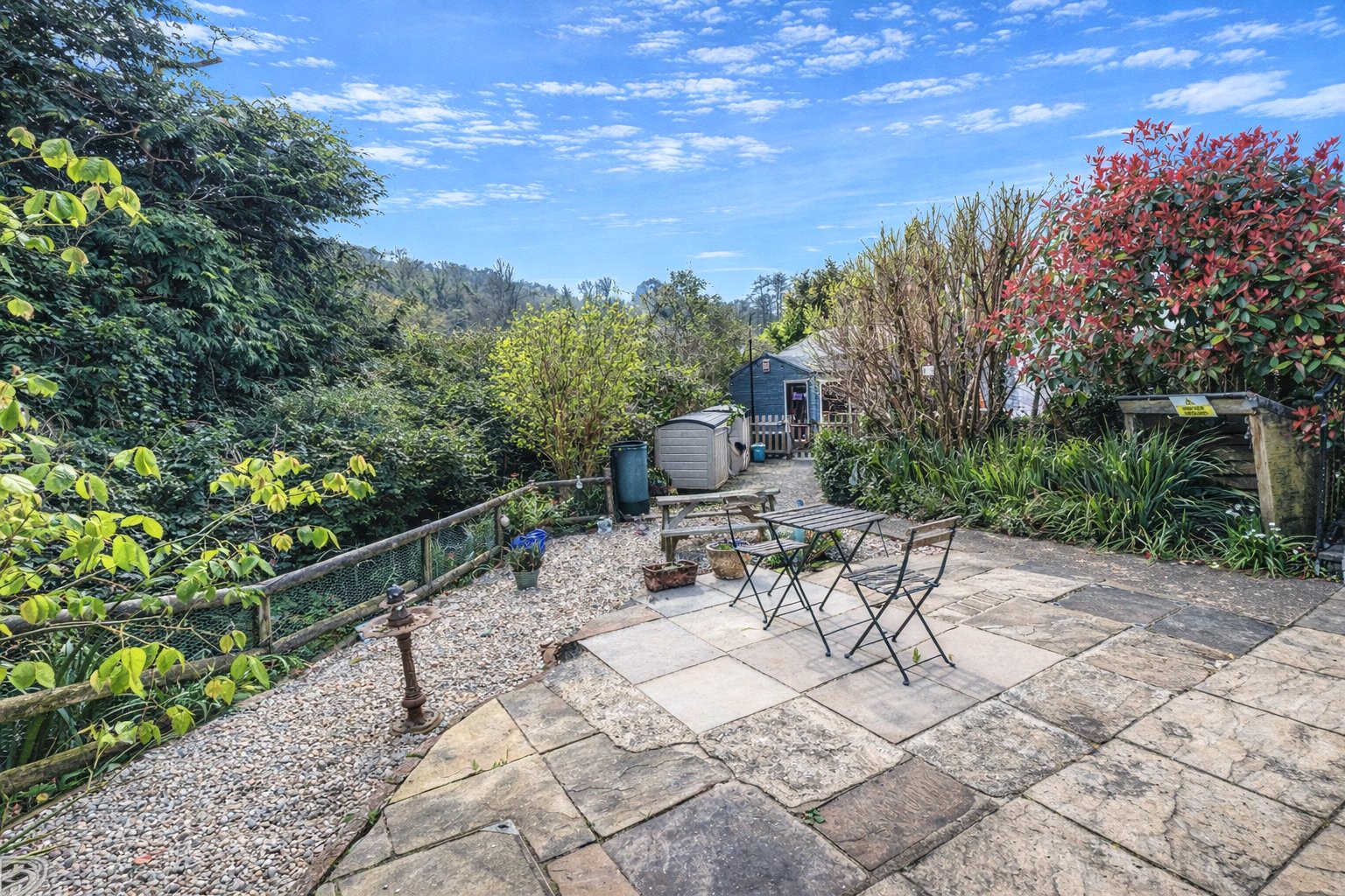 The entrance is approached via a gated pathway leading to the front door, bordered by mature shrubs and planting. Inside, the hallway provides a practical understairs storage cupboard, ideal for coats, shoes and household items.