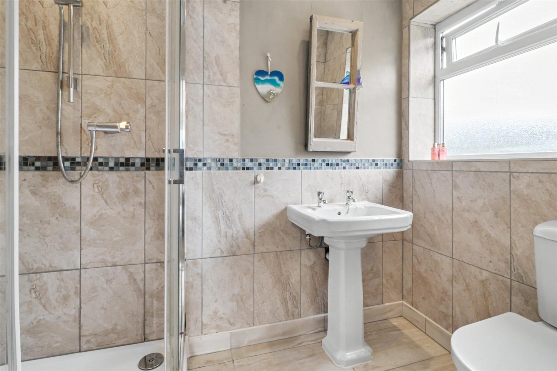 Upstairs, the first floor offers three well proportioned double bedrooms. The main bedroom benefits from its own ensuite shower room, fitted with a corner shower cubicle, low level wc and pedestal wash hand basin. The remaining bedrooms are served by a separate bathroom with panelled bath and pedestal wash hand basin, along with a separate wc.