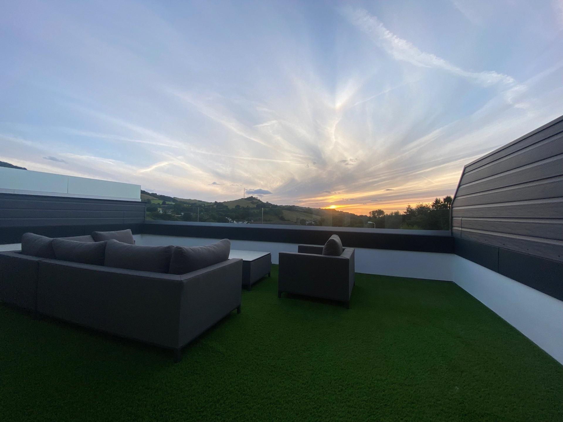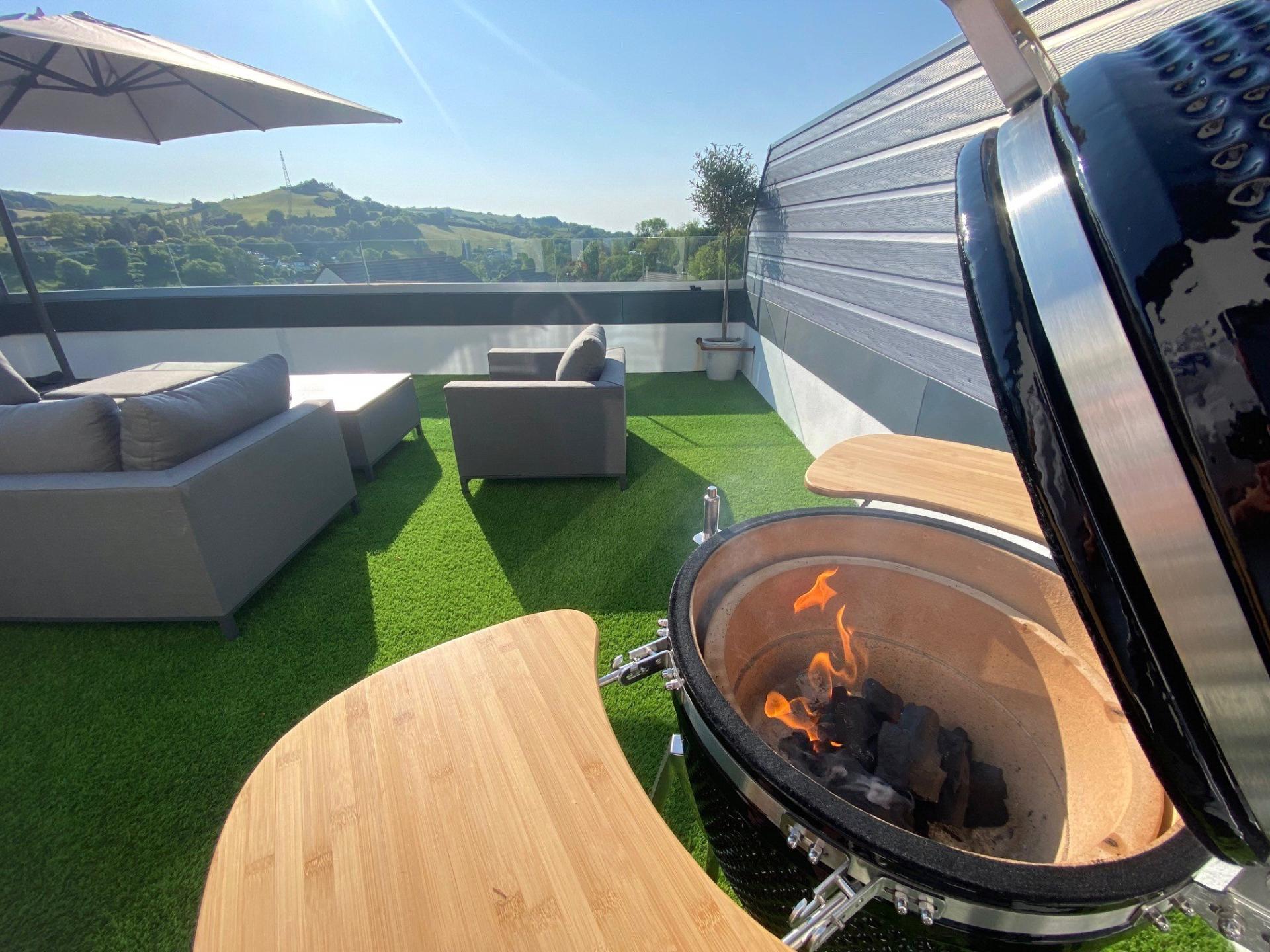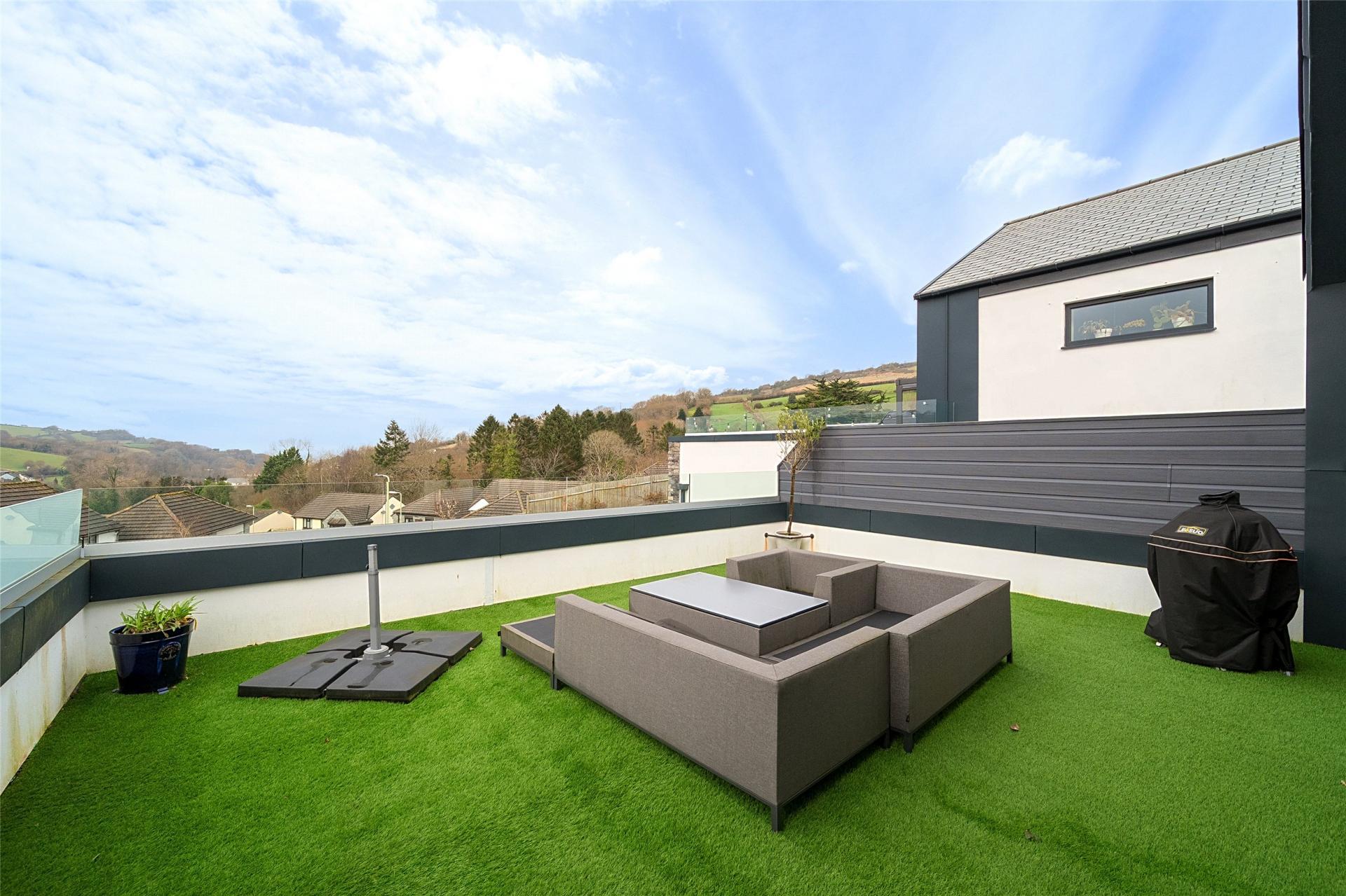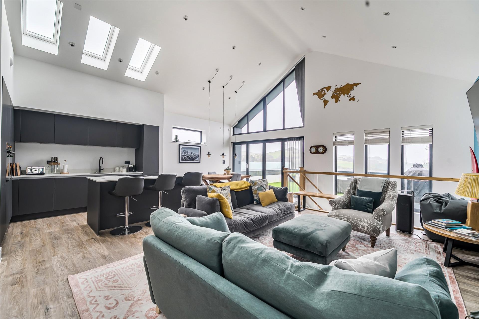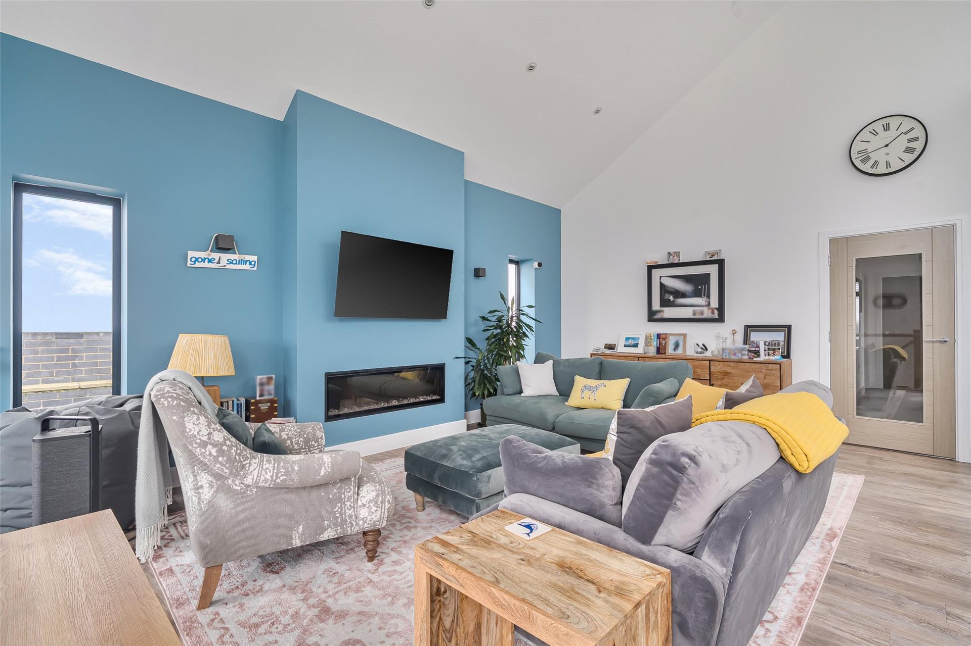 The main living accommodation occupies the first floor, where the design really opens up. A striking vaulted ceiling rising to around 15ft, fullheight glazing and multiple rooflights all work together to create a wonderfully bright, airy and social space. Bifold doors lead out onto a private roof terrace where you can relax, eat outdoors or simply enjoy the farreaching views. A contemporary feature fireplace offers a focal point inside, with wiring already in place for a wallmounted TV.