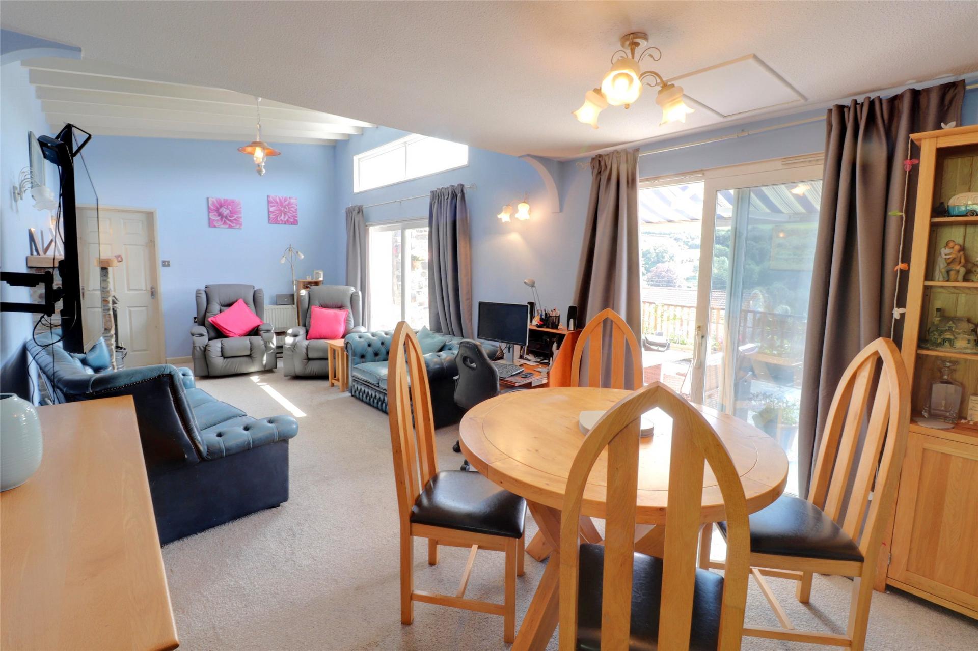 - Spacious lounge/dining room with exposed beams and sliding doors