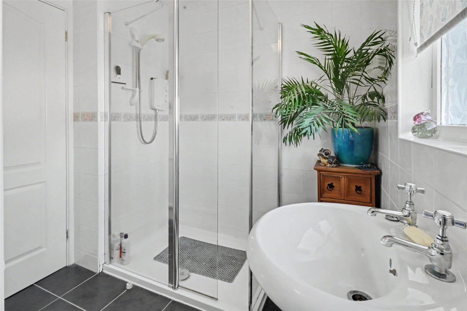 To the first floor, a split U-shaped landing provides access to the accommodation and features two useful built-in storage cupboards. Turning left from the landing is the third bedroom; the smallest of the three yet still of a generous size, benefiting from built-in sliding wardrobes, an additional storage cupboard positioned behind the door, and pleasant countryside views. Returning to the landing, the principal bedroom is located to the right and offers a further built-in storage cupboard. Continuing along the landing and passing the staircase leads to the family bathroom, fitted with an electric power shower, white wash hand basin, and WC. Completing the floor is a large airing cupboard, positioned just before the second bedroom, providing excellent additional storage.