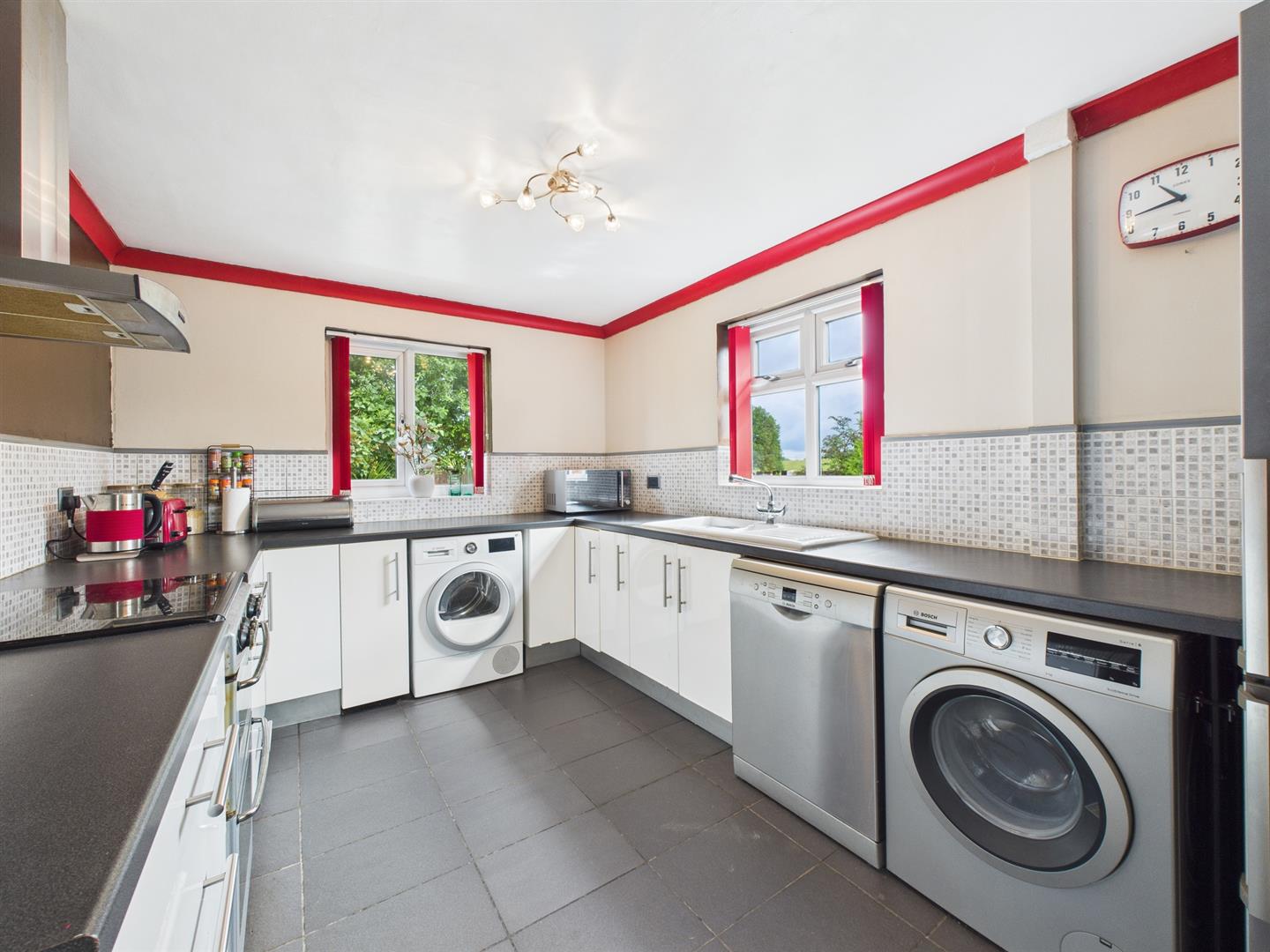 Kitchen - 4 x 2.8 (13'1" x 9'2") - Featuring roll edge preparation surfaces, tiled surround, inset ceramic one and a quarter stainless steel sink unit, fitted base cupboards and drawers, appliance spaces suitable for free standing cooker, fridge freezer, washing machine, tumble dryer and dishwasher. There is a central heating radiator, double glazed window to either side elevation and rear offering views.