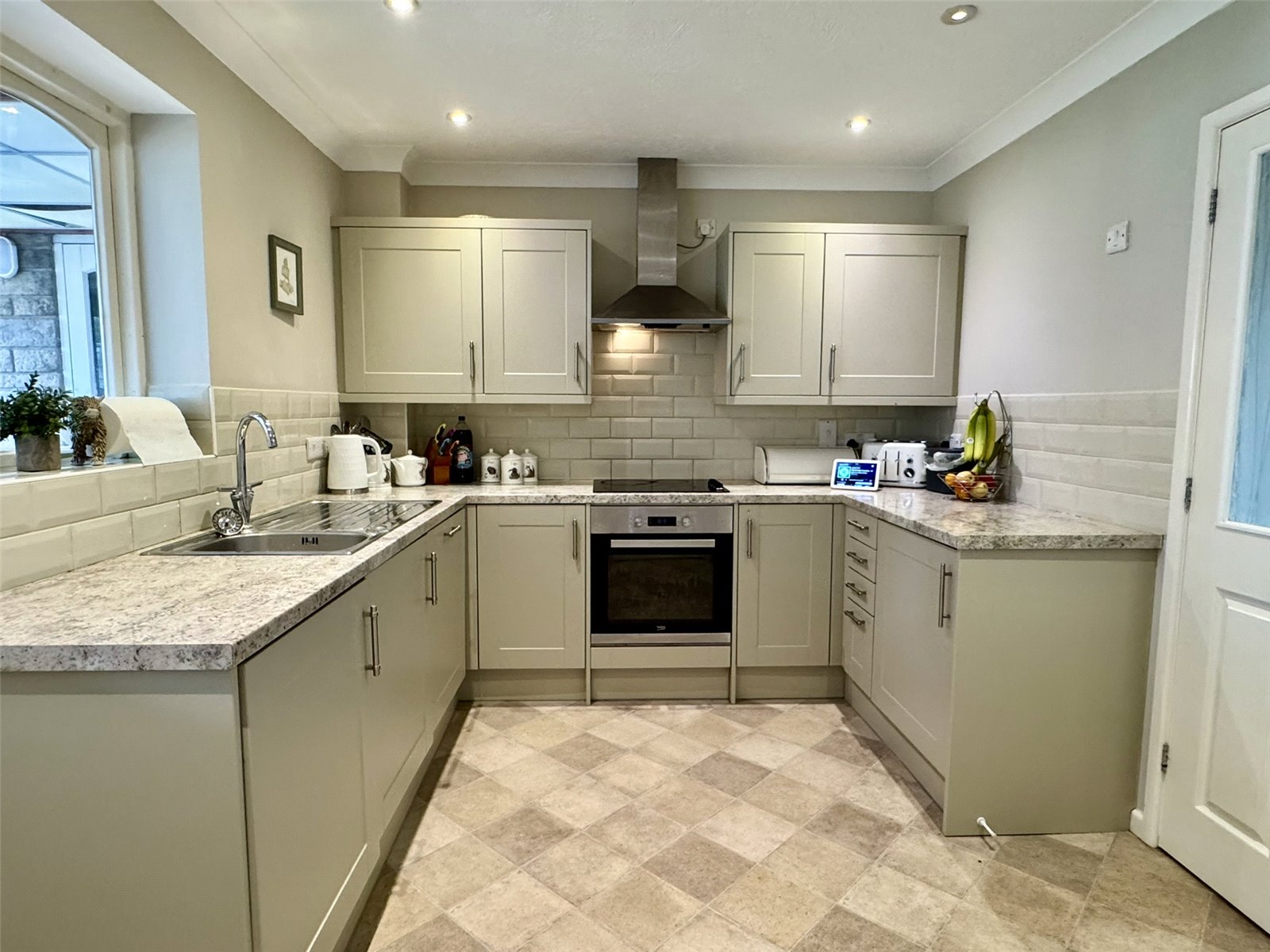 Kitchen 11'10" (3.60m) x 9' (2.75m) narrowing to 7'1" (2.16m). Fitted with modern matching wall and base units set beneath worktops with inset sink and drainer. Integrated fridge, integrated dishwasher, integrated washing machine, inset electric oven and hob with hood over. Under unit lighting, spotlights, radiator, understairs storage cupboard. Window and door out to conservatory. Doors to lounge and entrance hall.