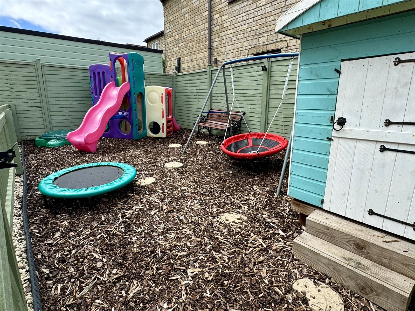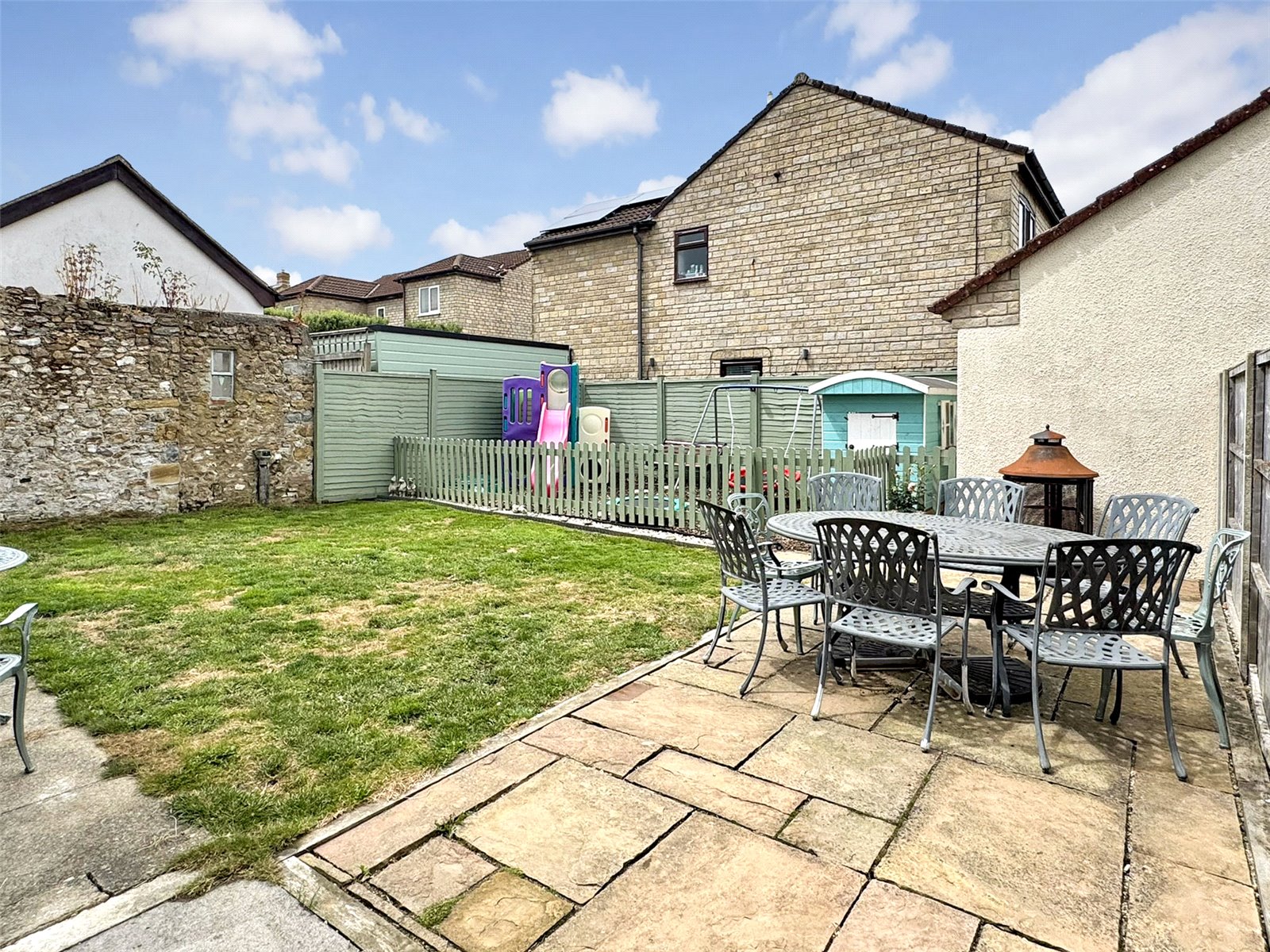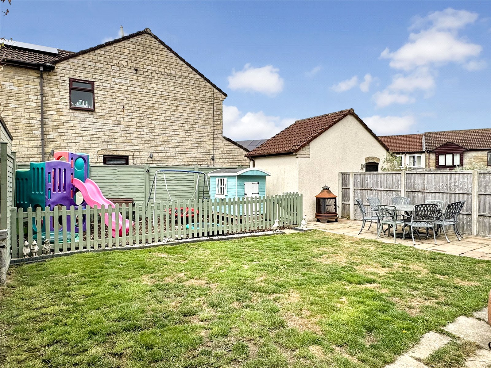 Rear The rear garden is mainly laid to lawn accompanied by a paved seating area to one side. A low level picket fence with wooden gate leads into a further area laid to bark. The lawn area continues along the side of the property giving access to a wooden storage shed, the side garden offers scope to potentially extend the property subject to the necessary consents.
