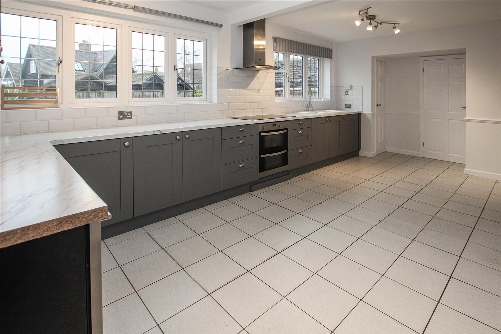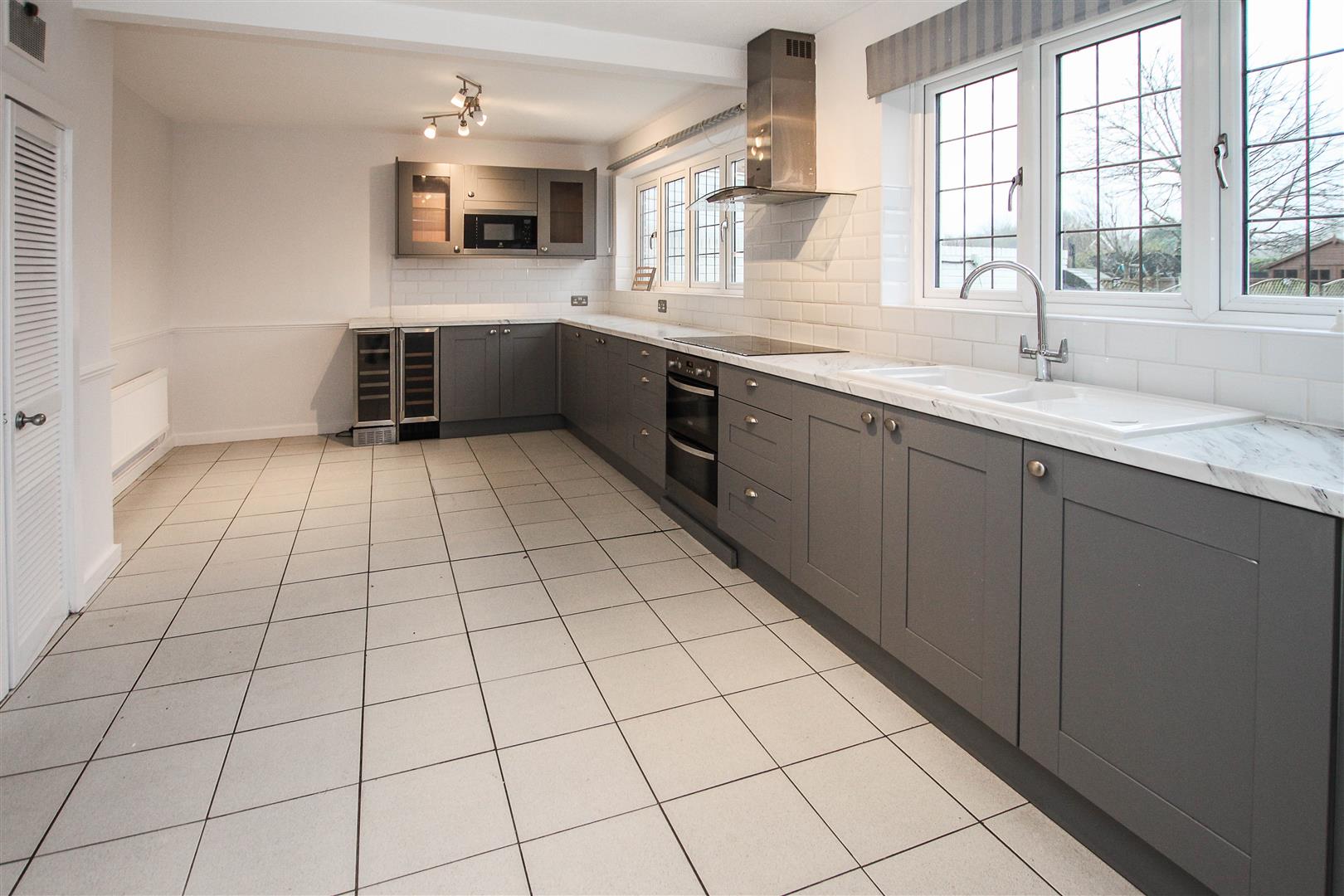 Kitchen / Diner - 6.38m x 3.58m (20'11 x 11'9) - Windows to rear aspect. Fitted in a range of grey 'Shaker' style wall and base units. Integrated appliances to include : double oven, microwave, hob with extractor above and double fronted wine chiller. Door to :
