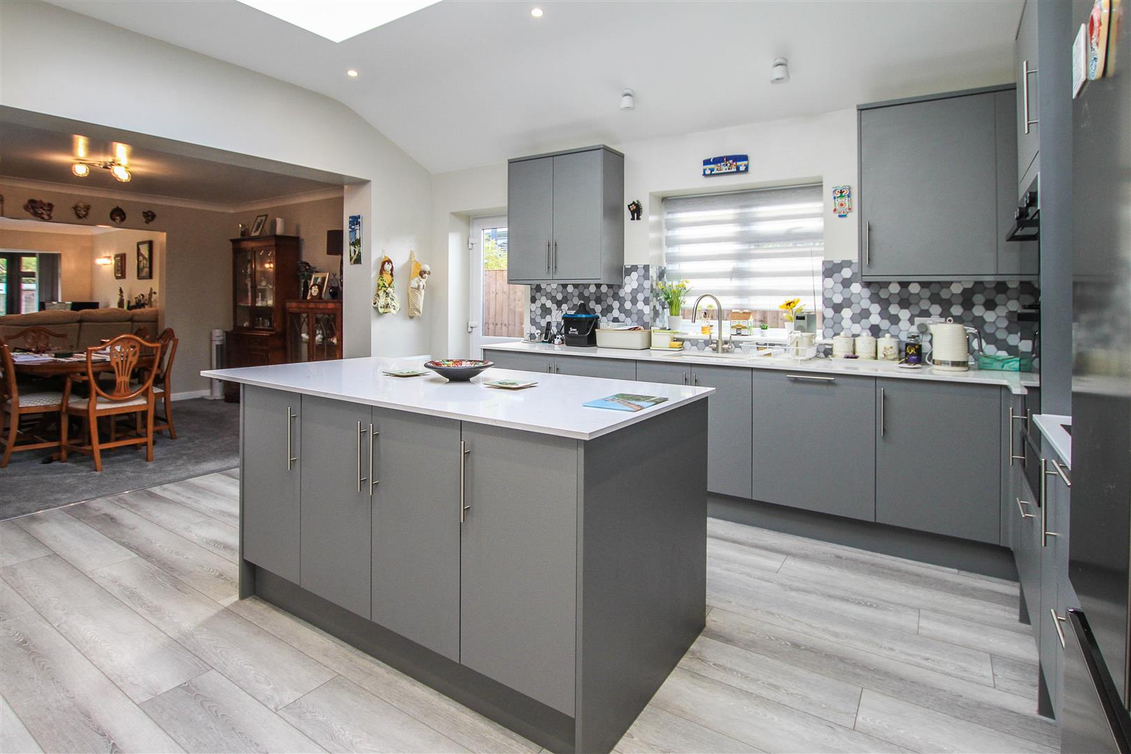 The property has been extended to the rear to incorporate a modern kitchen/breakfast room with stylish, dark grey, wall and base units with quartz work surface over, and includes a central island unit with additional storage and seating. A large roof lantern fills the room with plenty of natural lighting, and there is a door to the side access. Integrated appliances include double oven, hob with extractor above and dishwasher and there is ample space for further appliances including a double fridge/freezer. The kitchen is open plan to a spacious dining room which in turn opens into a comfortable lounge with lovely bi-folding doors to one end, giving access into the rear garden.