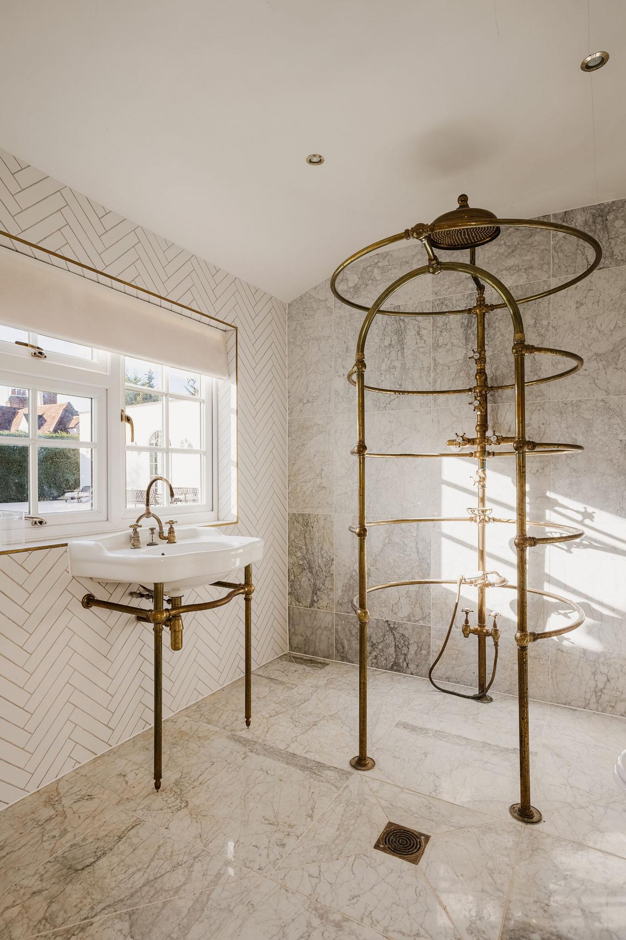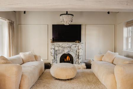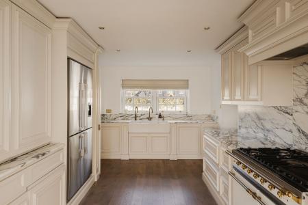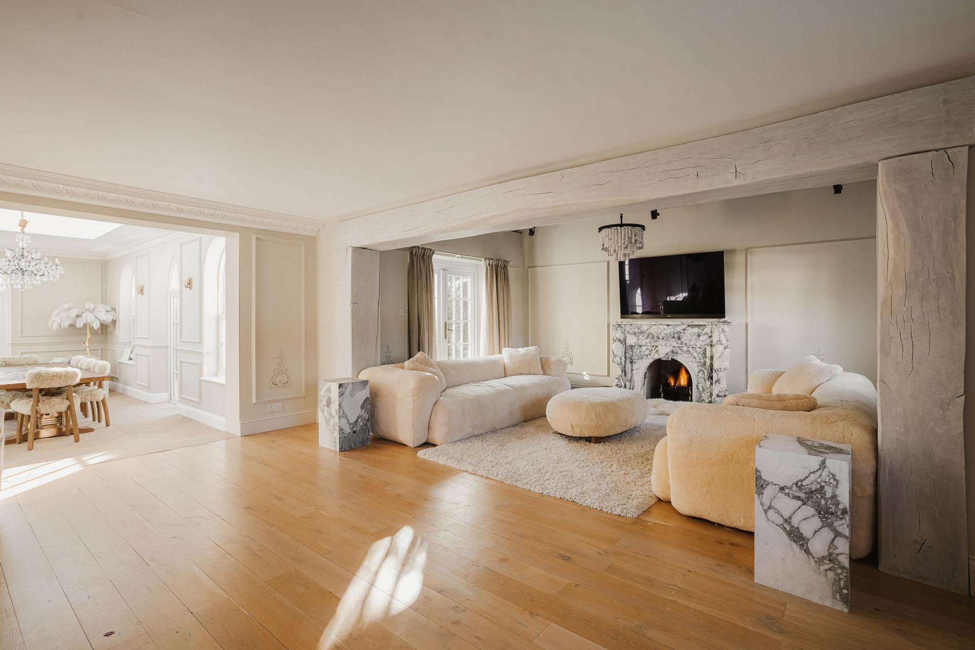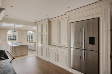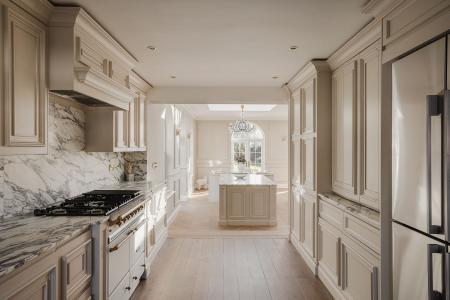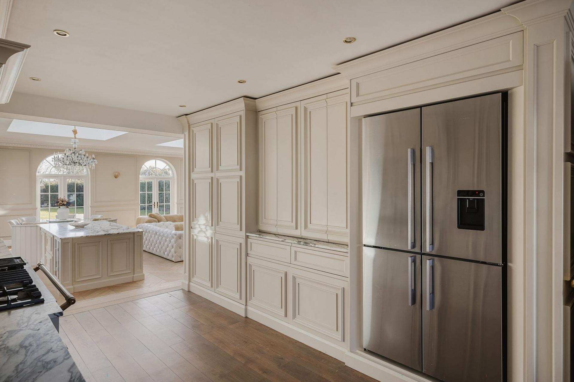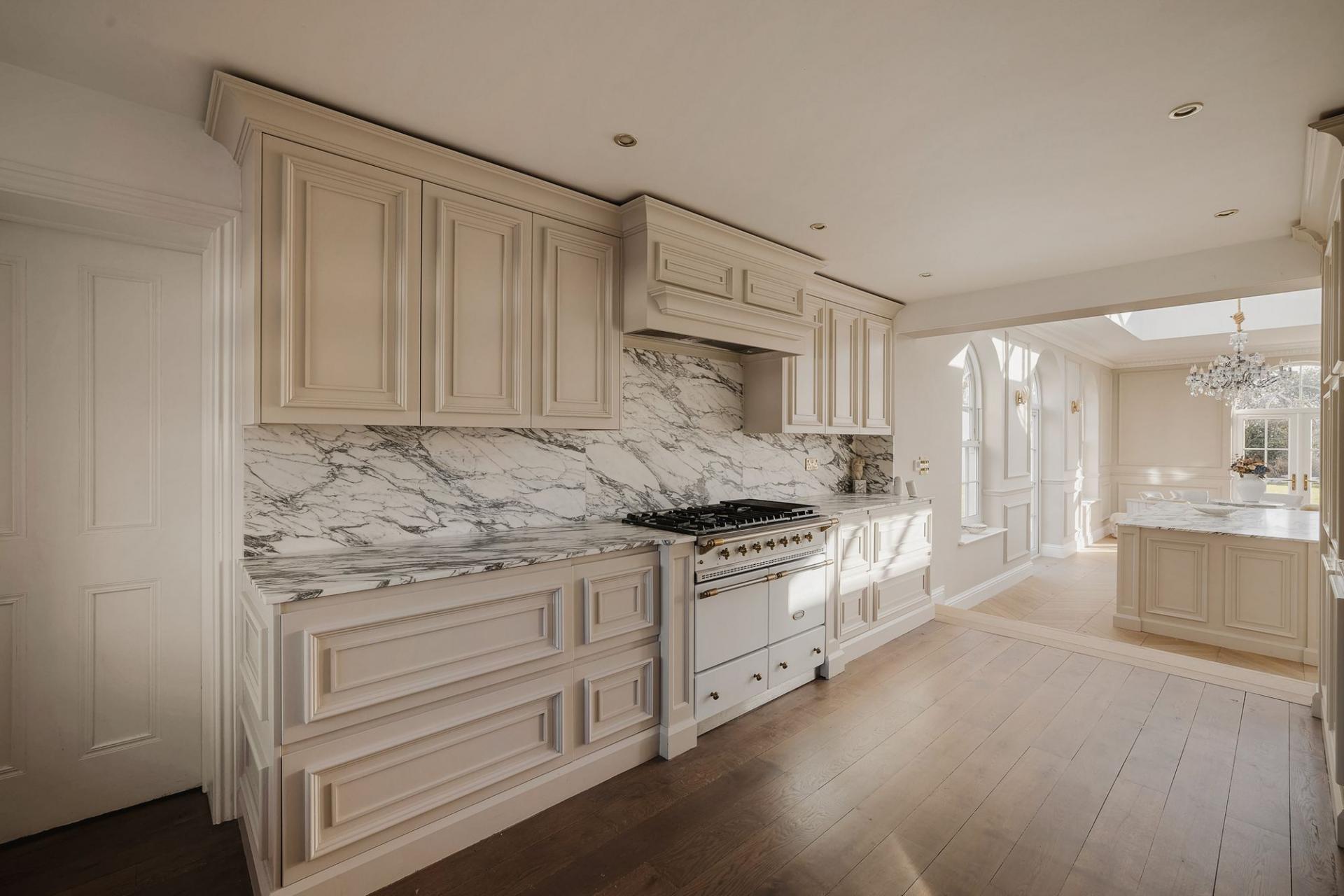 - Handmade bespoke kitchen and custom Arabescato marble fireplace