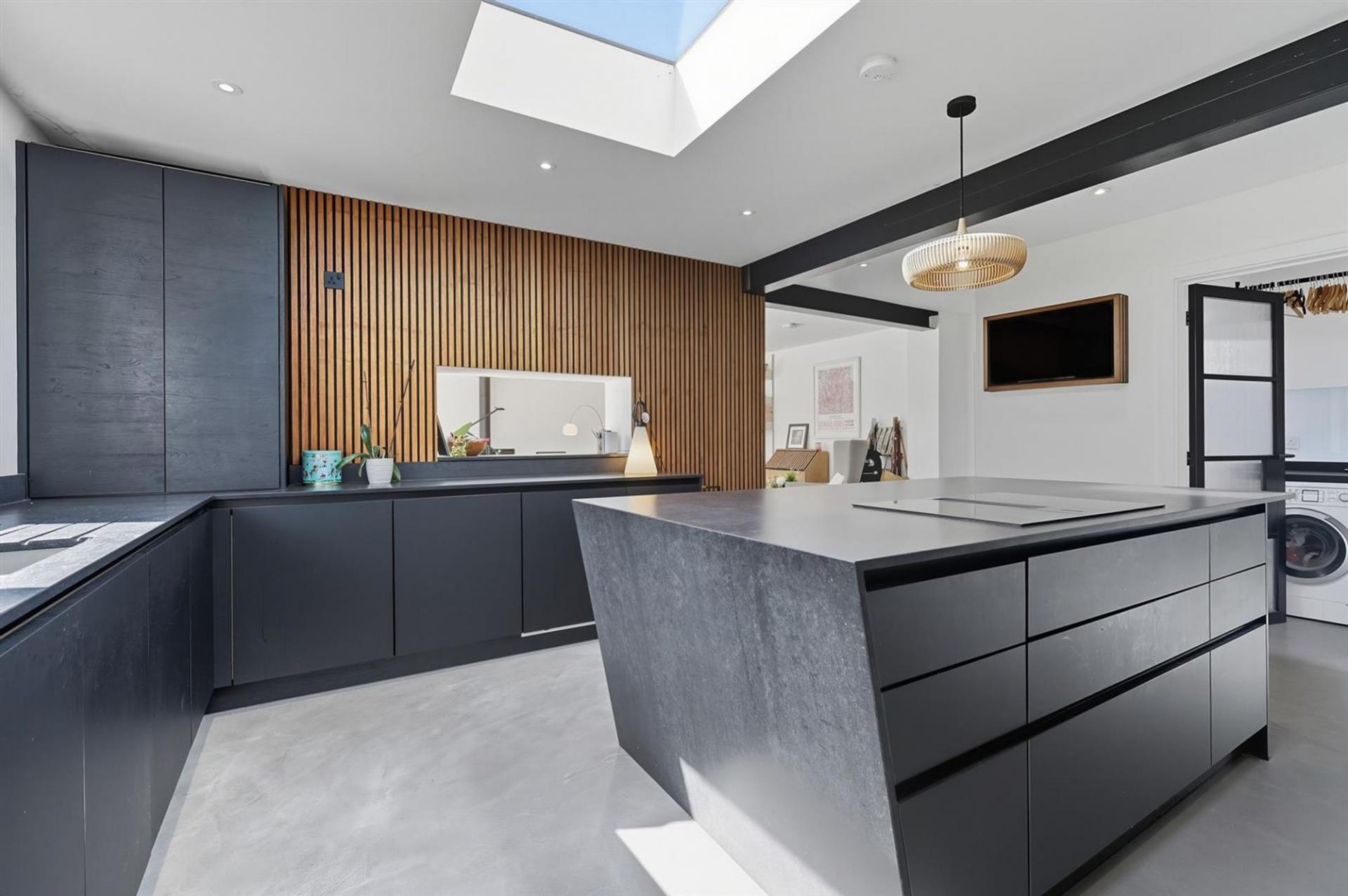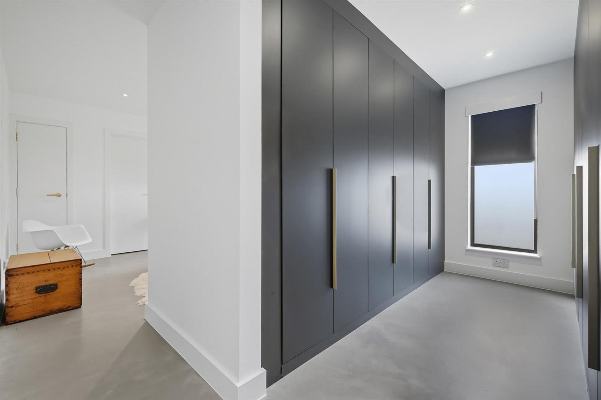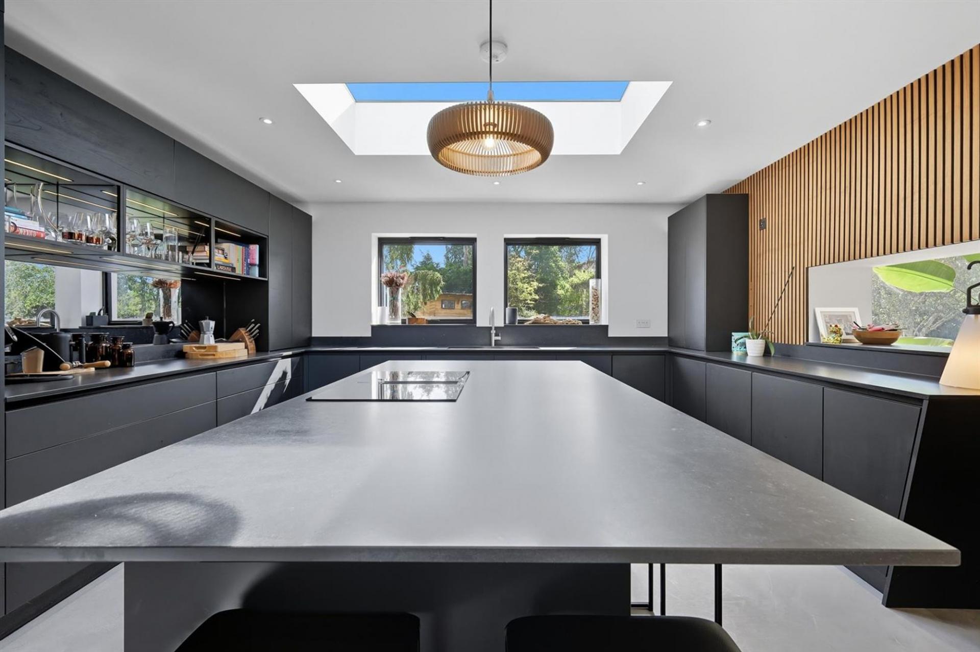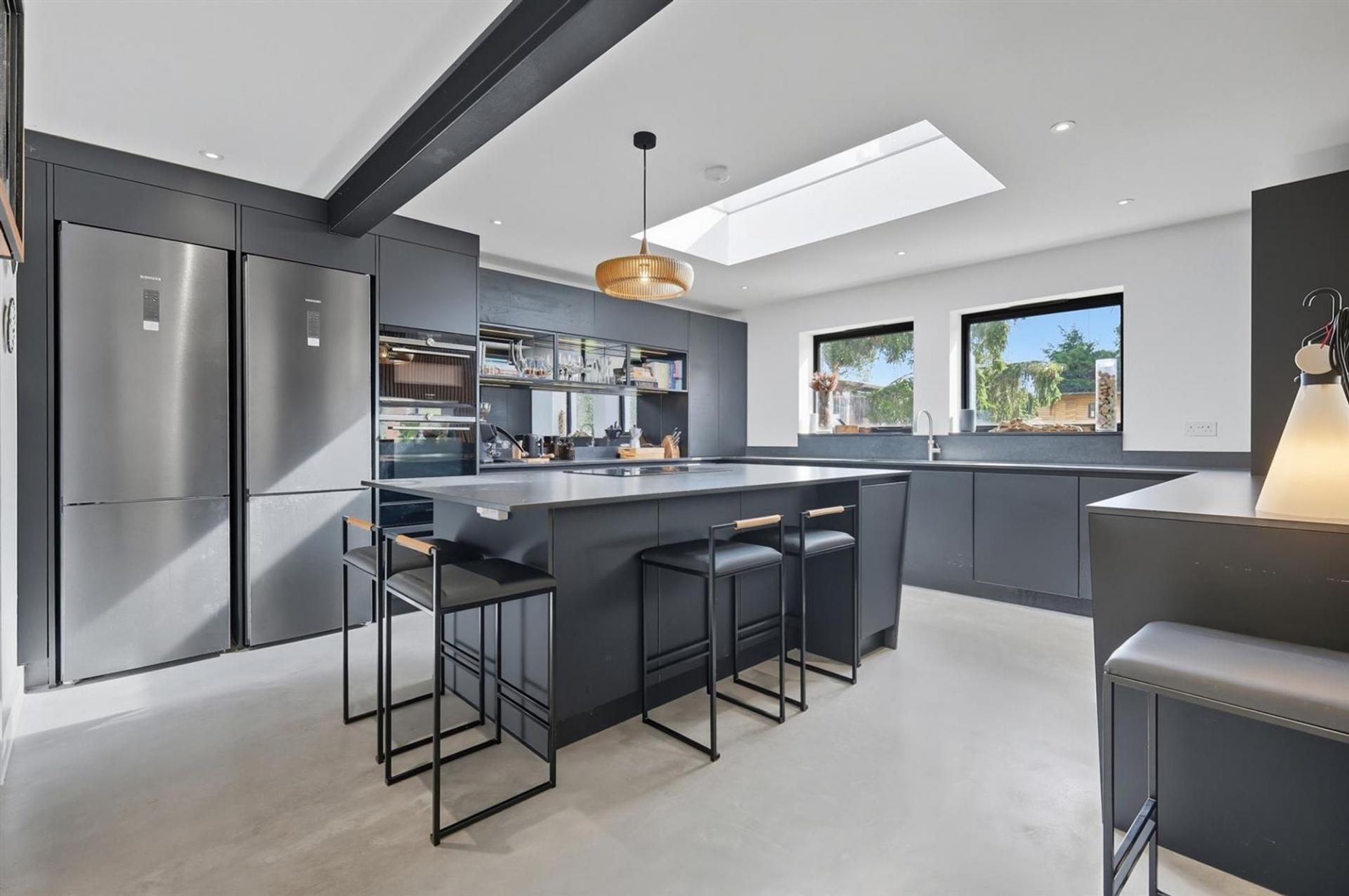 At the centre of the home lies a stunning open-plan kitchen, breakfast, and dining space, finished with polished concrete flooring and equipped with high-quality Siemens and Miele appliances, a Bora hob with downdraft extractor, drinks fridge, and Quooker hot/cold/sparkling tap. This sociable space flows seamlessly into the dual-aspect lounge, where two sets of double doors open directly onto the rear terrace and garden, creating a strong connection between indoors and outdoors. A separate utility room completes the ground floor accommodation.