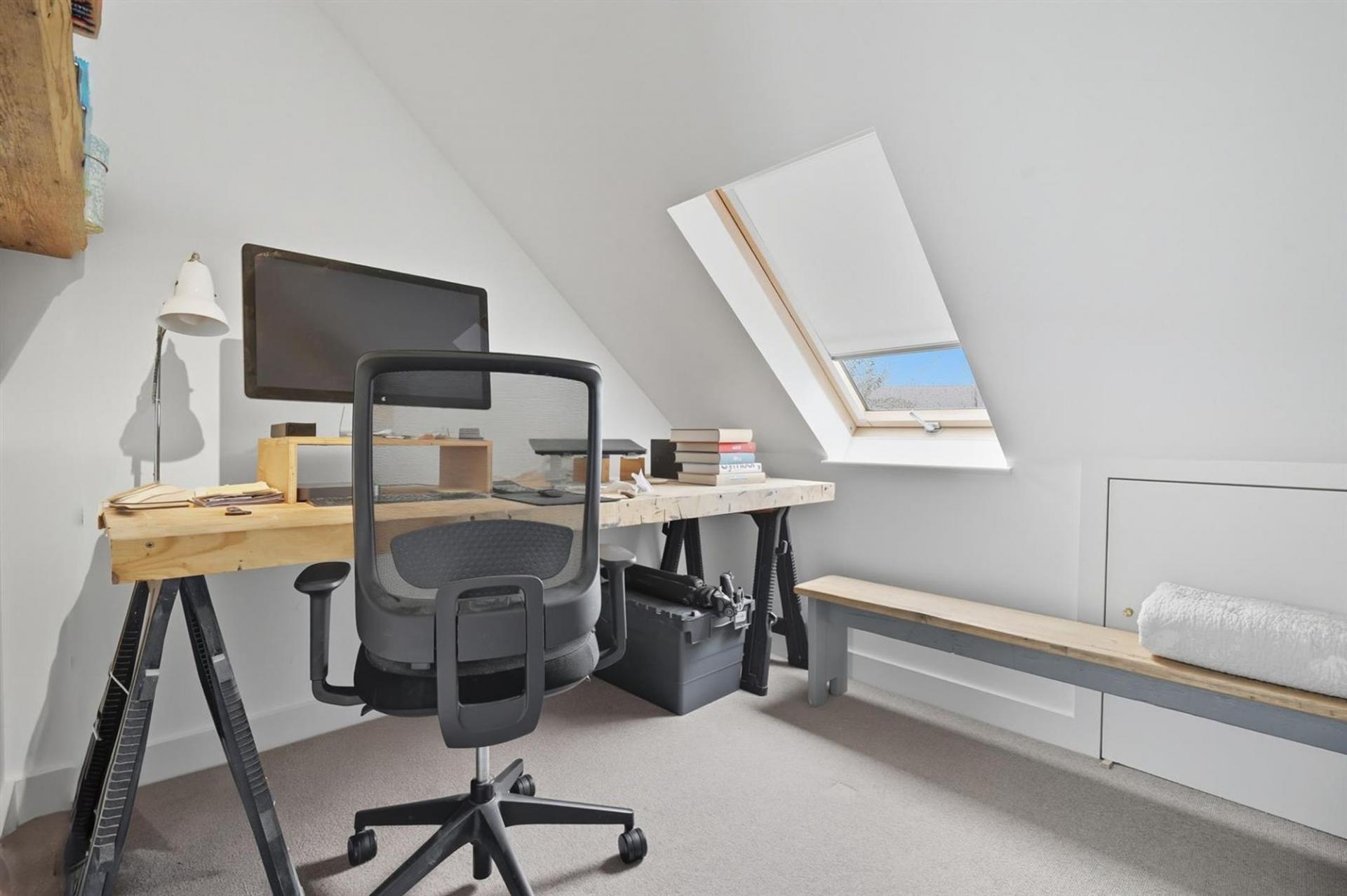 Upstairs, two further double bedrooms offer flexibility for family, guests, or home working — one enjoying dual-aspect windows, and the other Velux windows to the front. A stylish family bathroom with bath, WC, and wash hand basin serves this level, while ample eaves storage provides additional practicality.