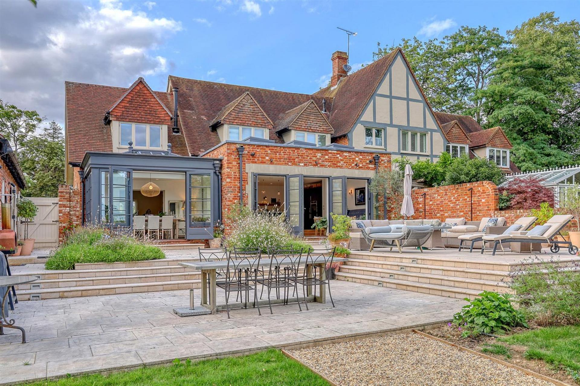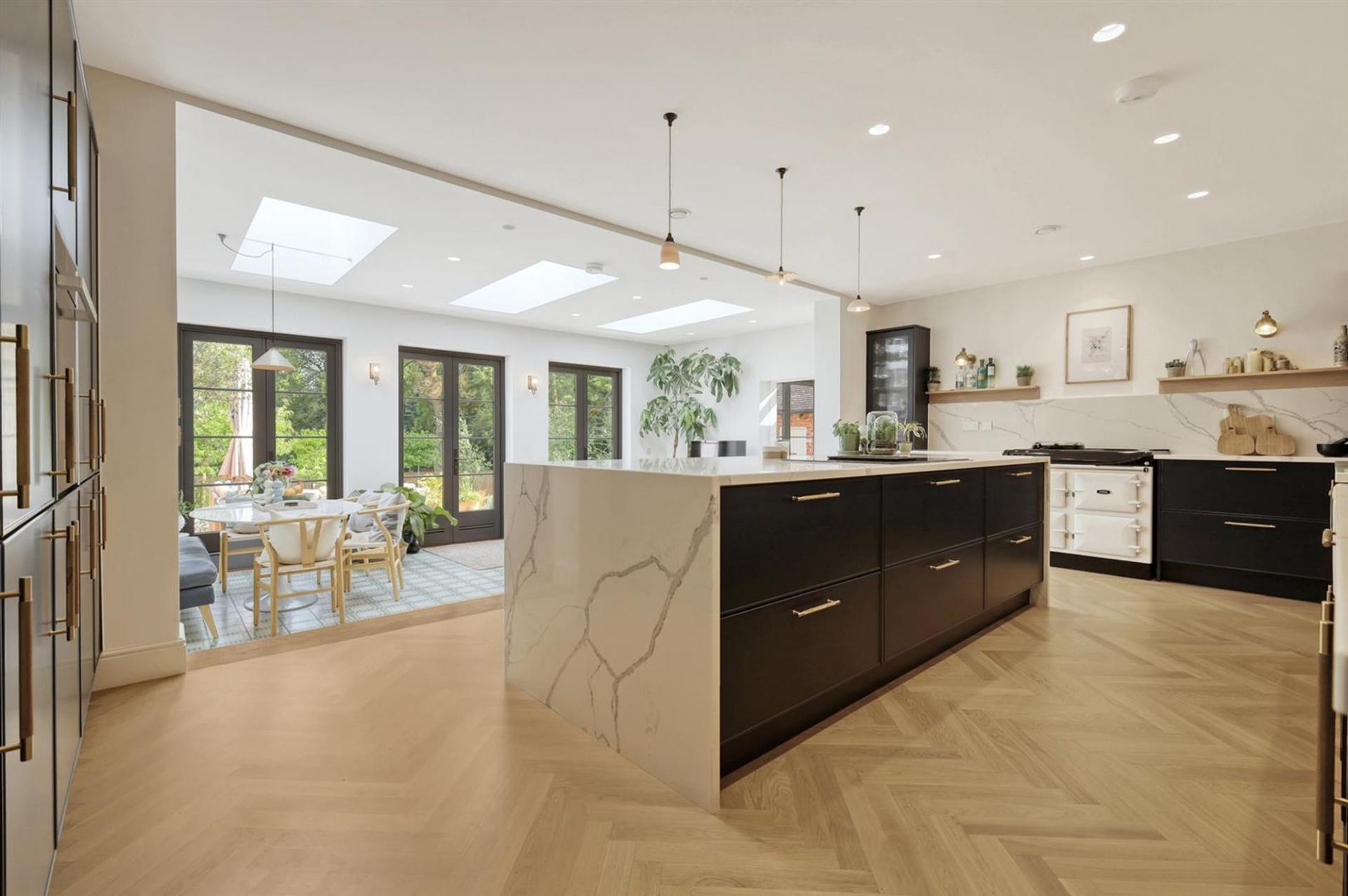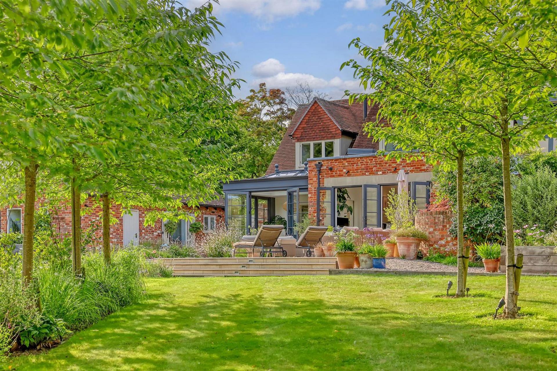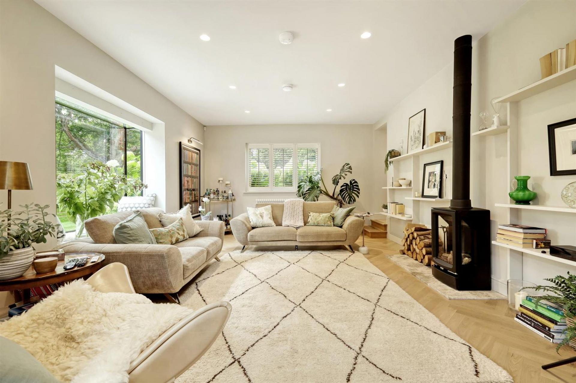 The ground floor offers an impressive entrance hall, spacious living room with gas fired stove and cantilevered box window overlooking the church grounds, and an elegant dining room/orangery overlooking the wonderful, landscaped gardens. A bespoke, open-plan kitchen with large central island and separate pantry flows into the family room with striking floor-to-ceiling glazing, flooding the space with natural light with three sets of French doors leading to the rear terrace. Additional practical features include a utility room, boot room, and downstairs WC.