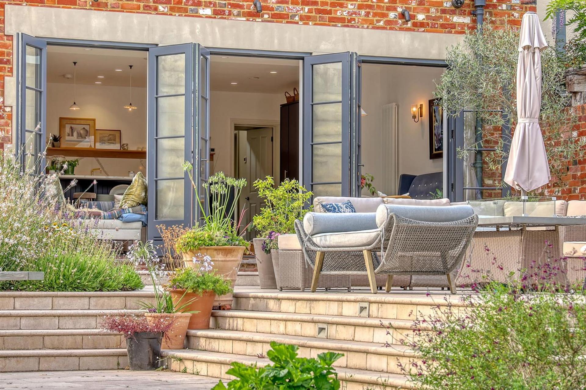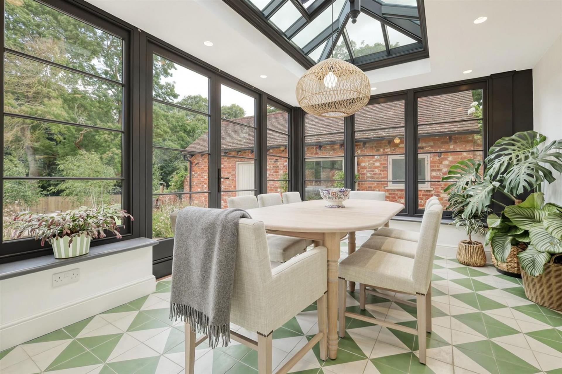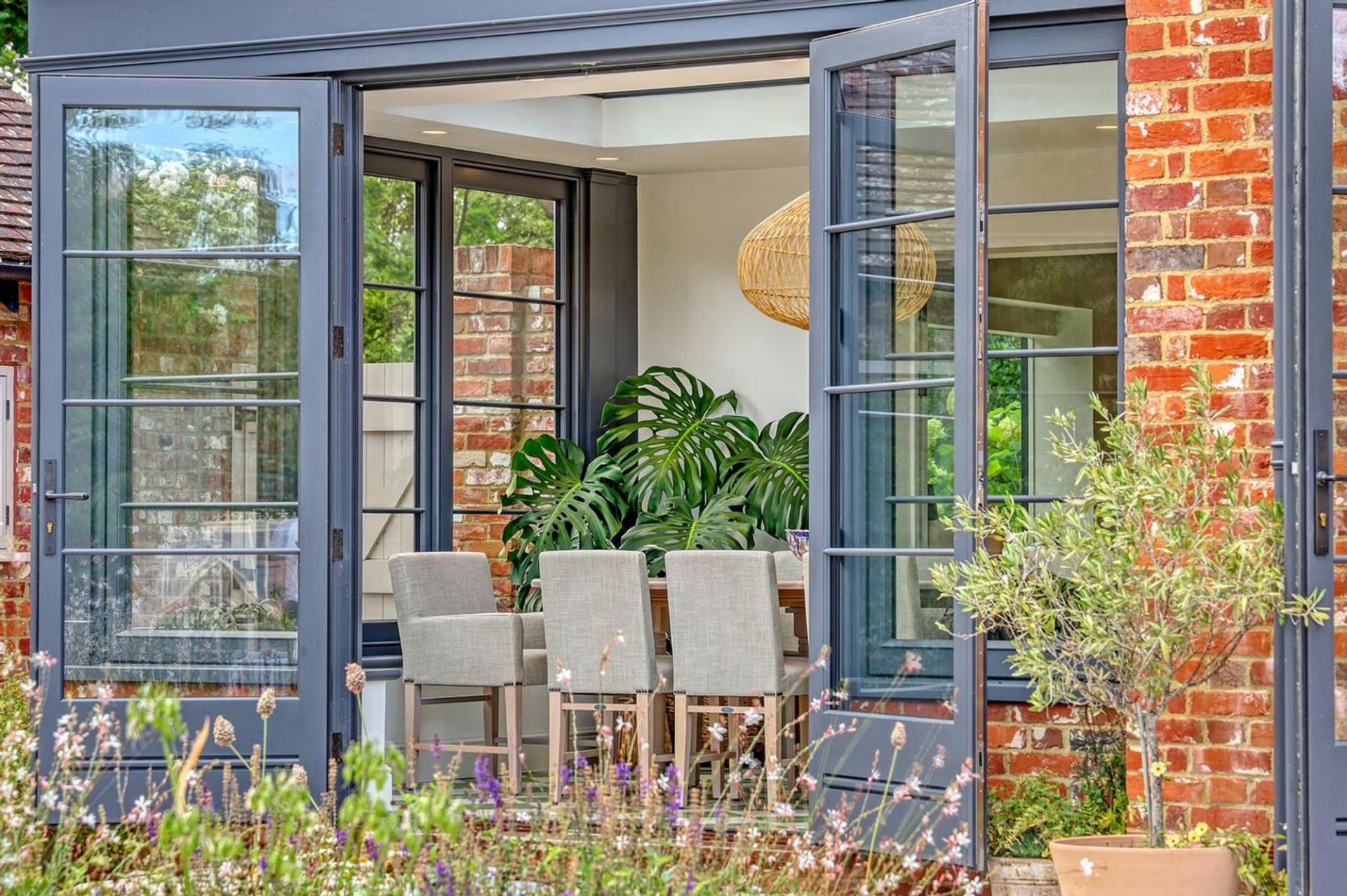 The ground floor offers an impressive entrance hall, spacious living room with gas fired stove and cantilevered box window overlooking the church grounds, and an elegant dining room/orangery overlooking the wonderful, landscaped gardens. A bespoke, open-plan kitchen with large central island and separate pantry flows into the family room with striking floor-to-ceiling glazing, flooding the space with natural light with three sets of French doors leading to the rear terrace. Additional practical features include a utility room, boot room, and downstairs WC.
