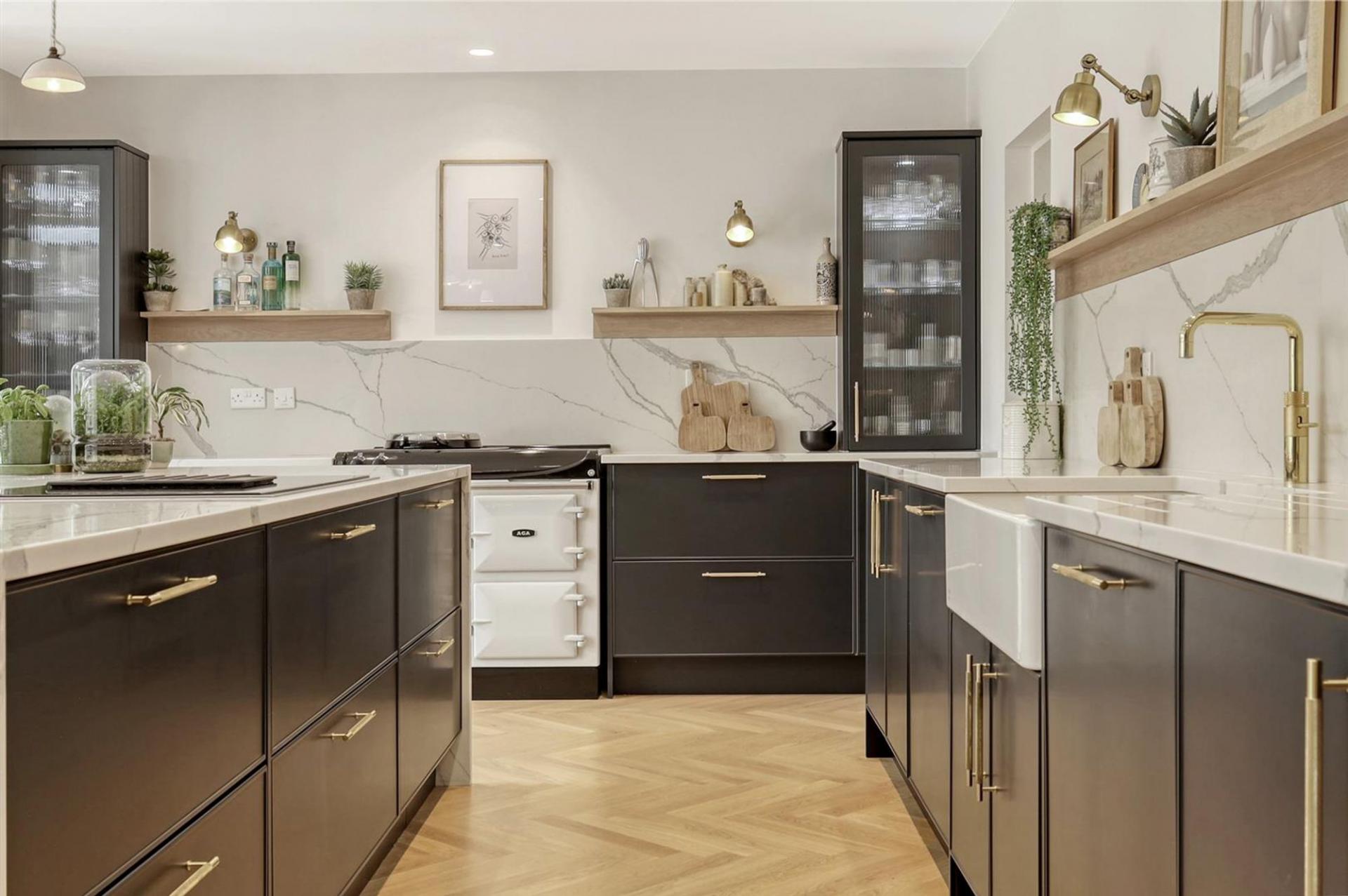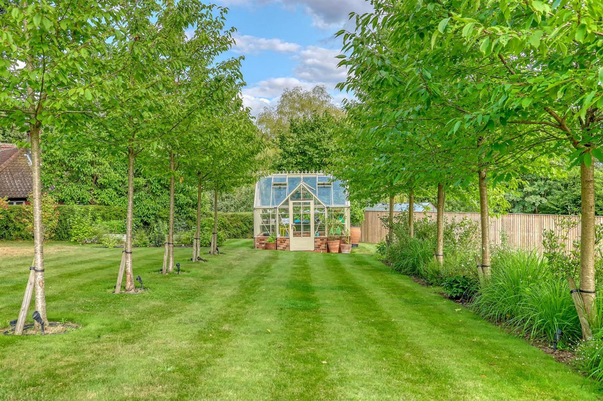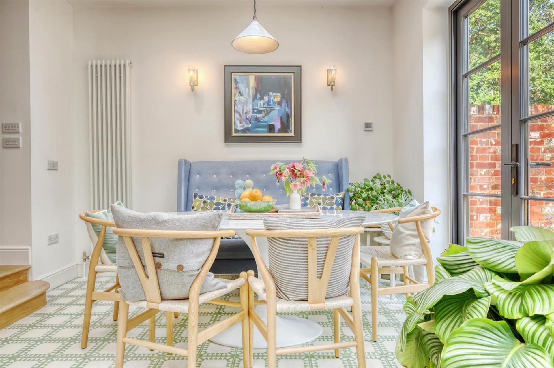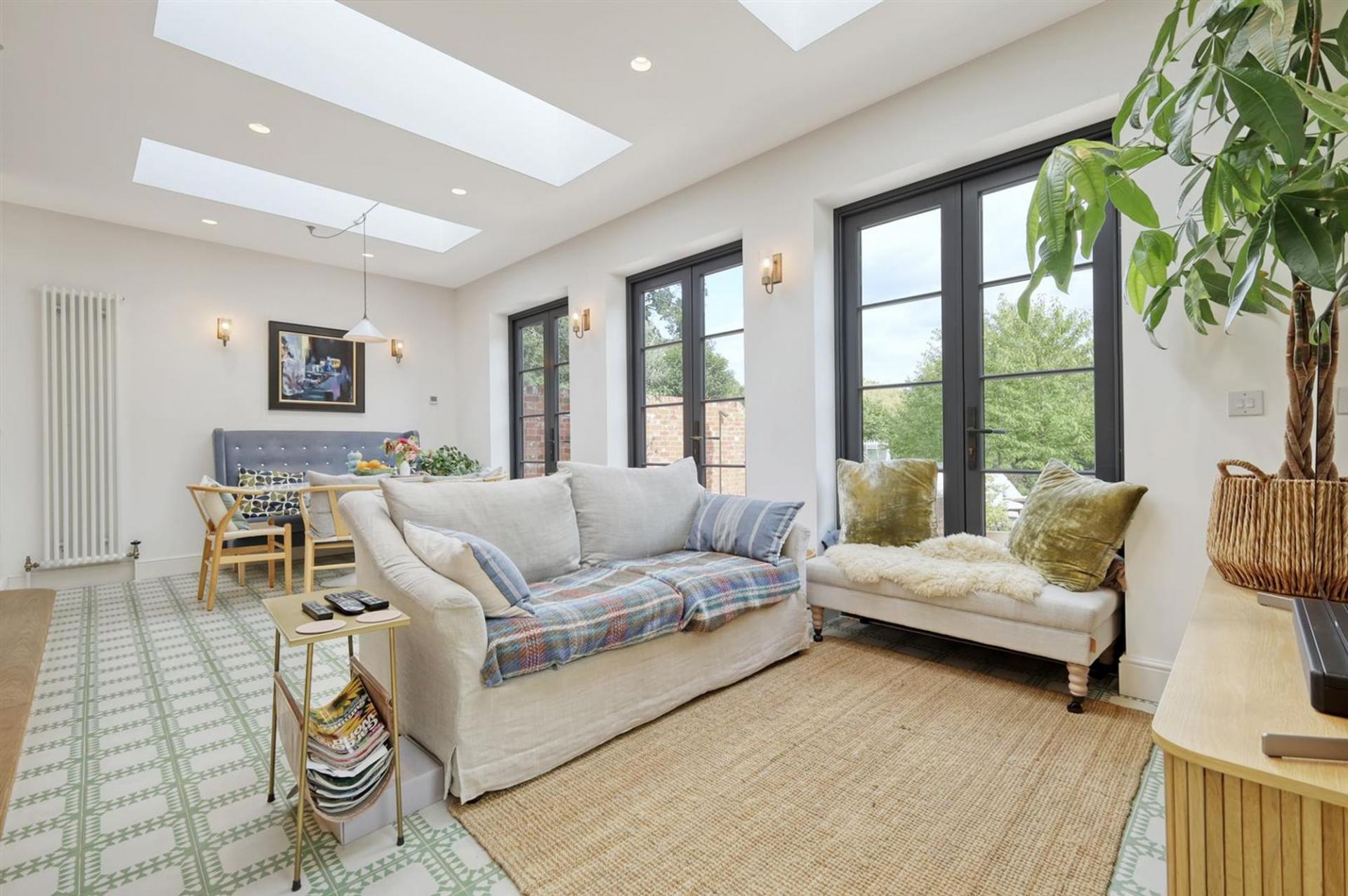 The ground floor offers an impressive entrance hall, spacious living room with gas fired stove and cantilevered box window overlooking the church grounds, and an elegant dining room/orangery overlooking the wonderful, landscaped gardens. A bespoke, open-plan kitchen with large central island and separate pantry flows into the family room with striking floor-to-ceiling glazing, flooding the space with natural light with three sets of French doors leading to the rear terrace. Additional practical features include a utility room, boot room, and downstairs WC.