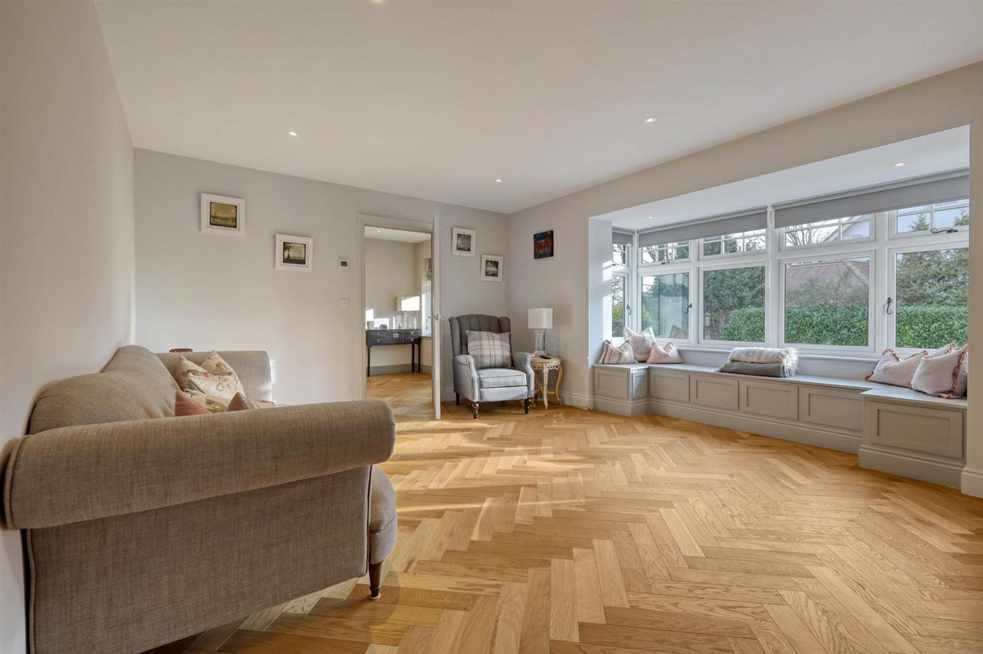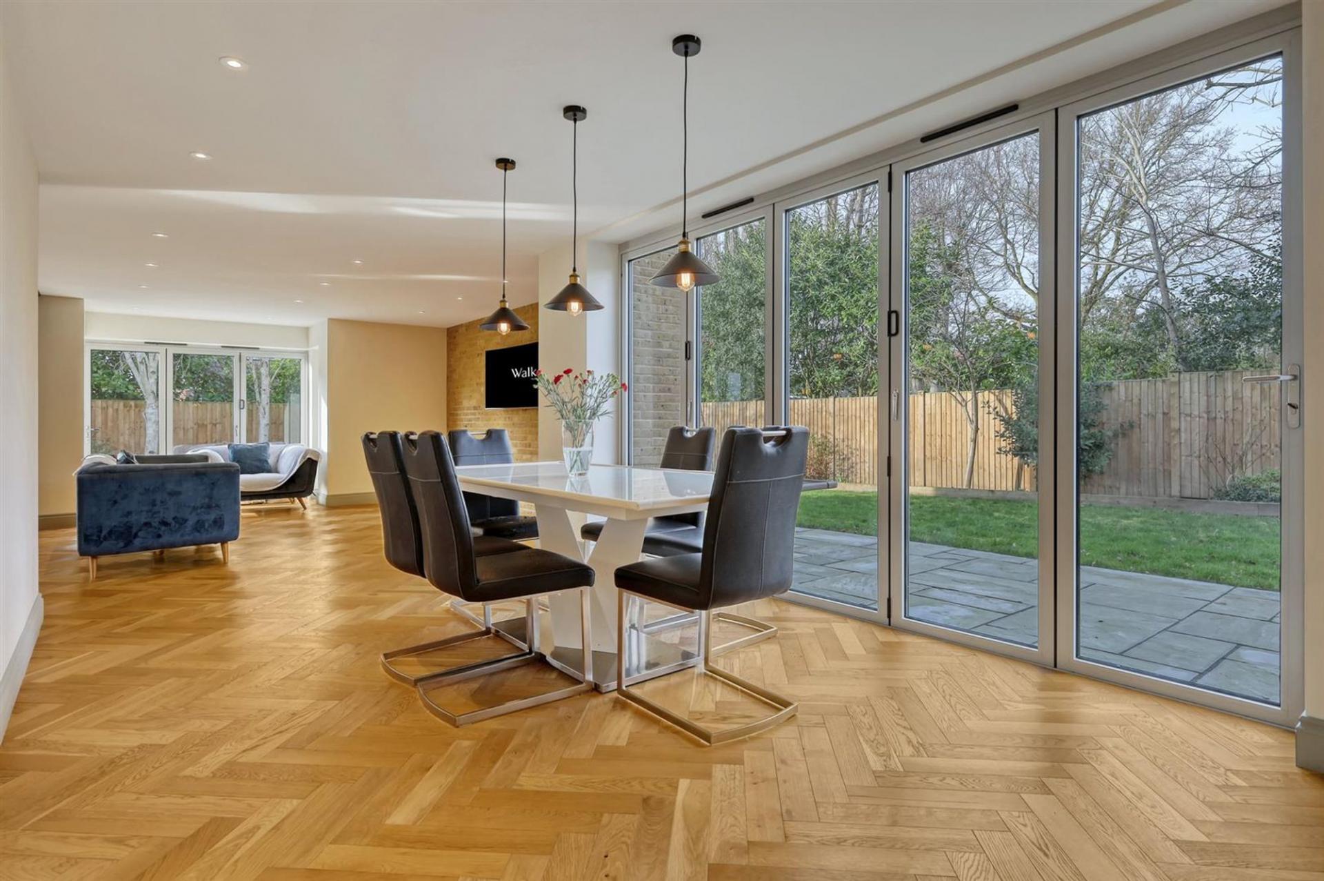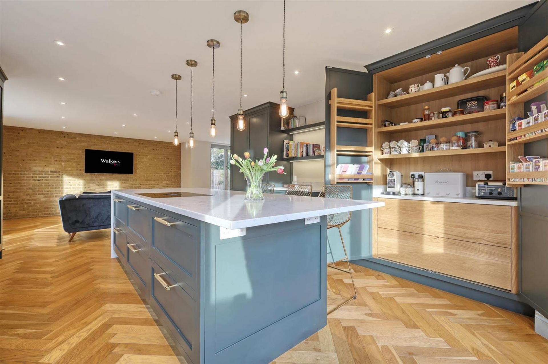 The heart of the home is the impressive designer kitchen, featuring dark cabinetry paired with oak drawers and shelves finished with dovetail detailing, complemented by premium Siemens appliances, a Bora hob, a wine fridge, and elegant pendant lighting. This space seamlessly flows into versatile open-plan areas, enhanced by stunning wooden herringbone flooring with zoned heating throughout the ground floor.
