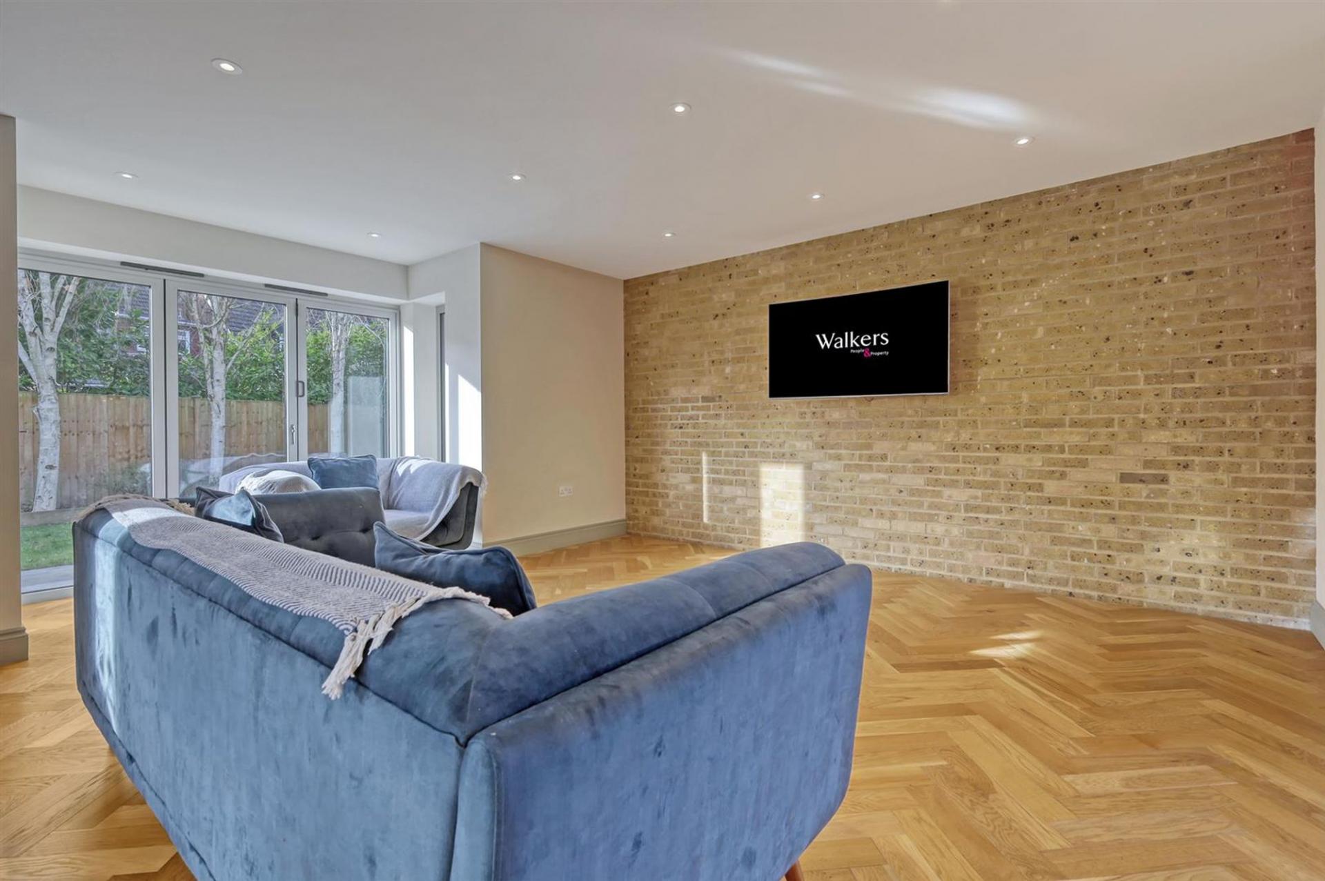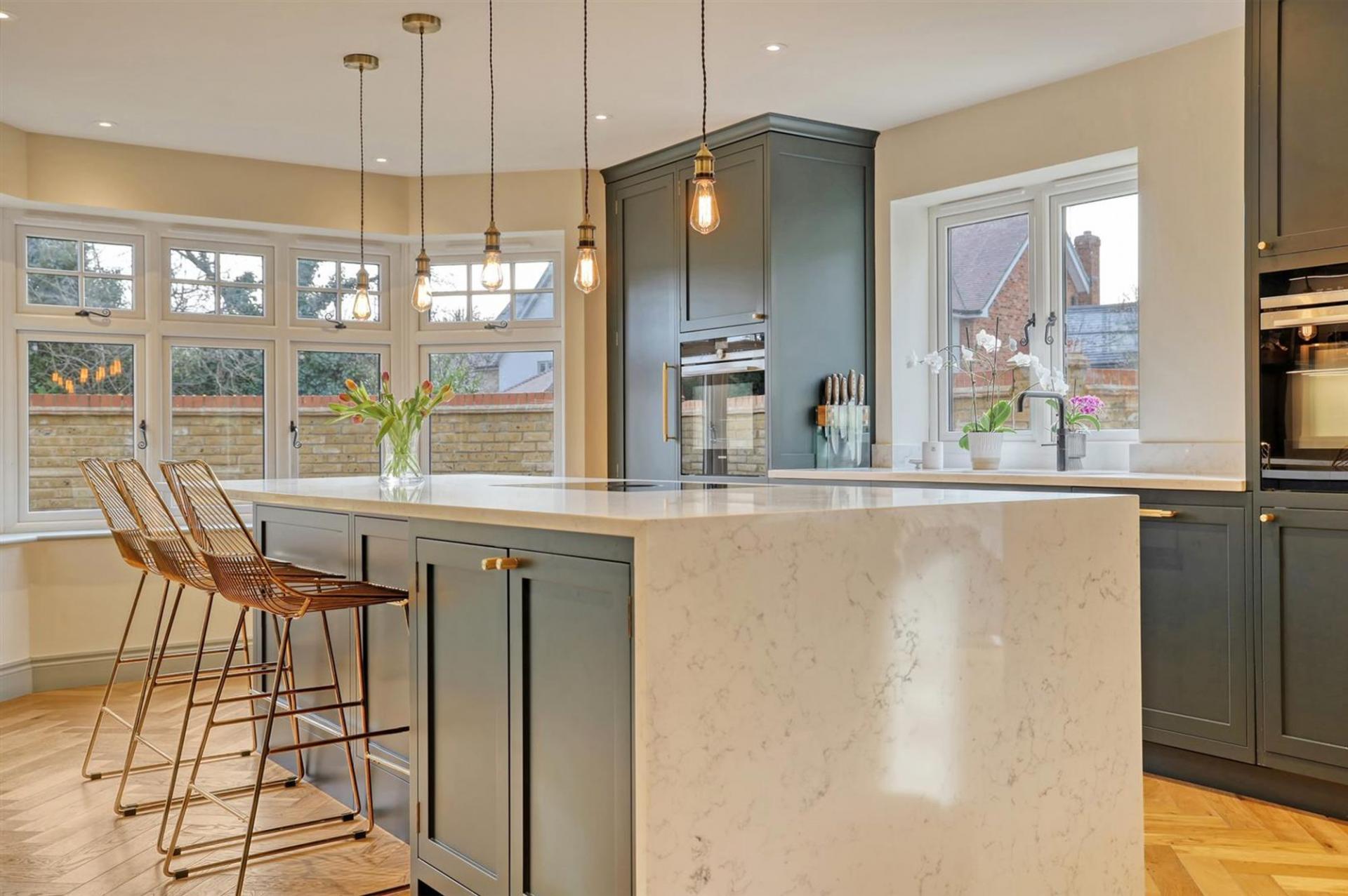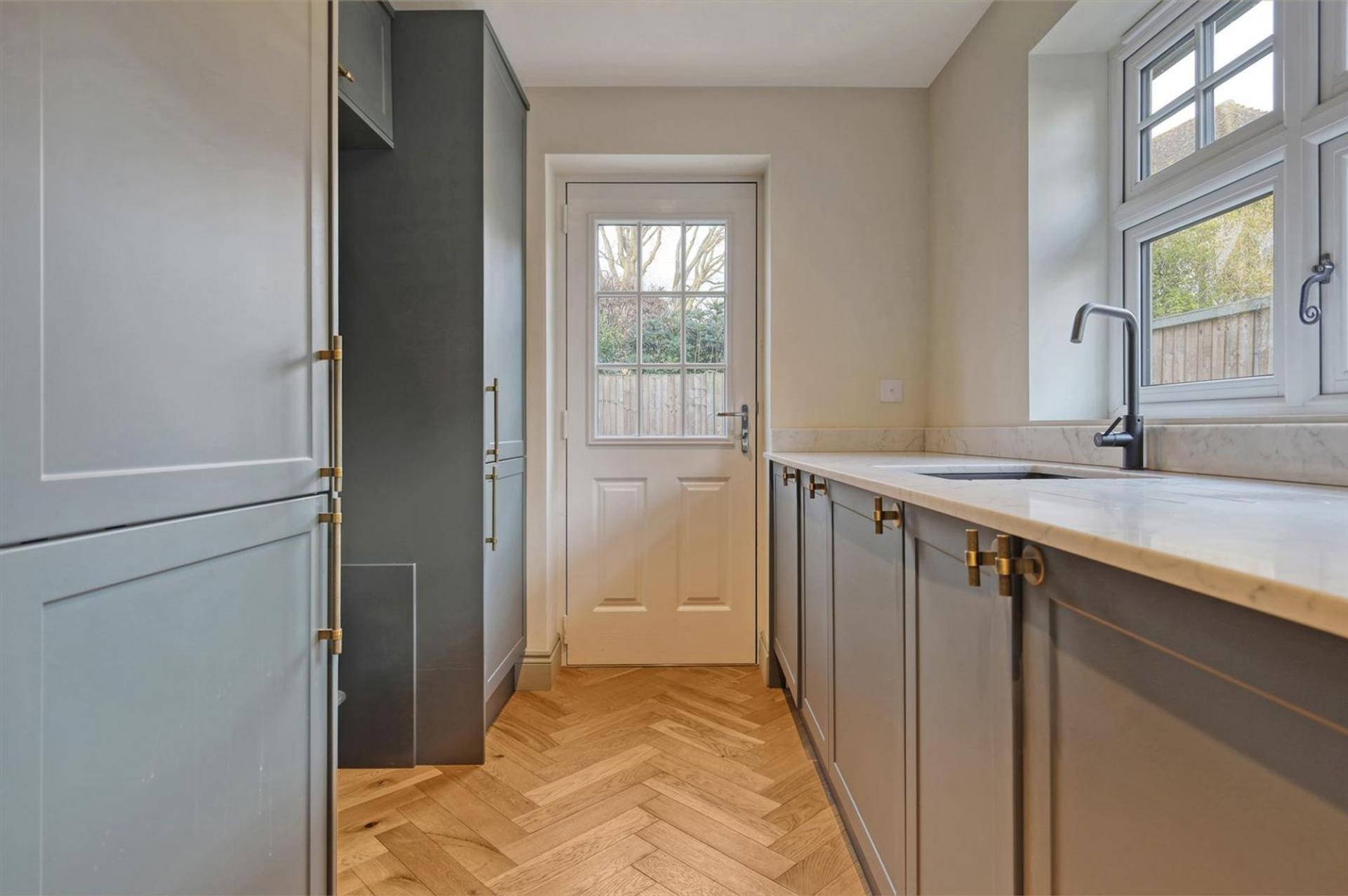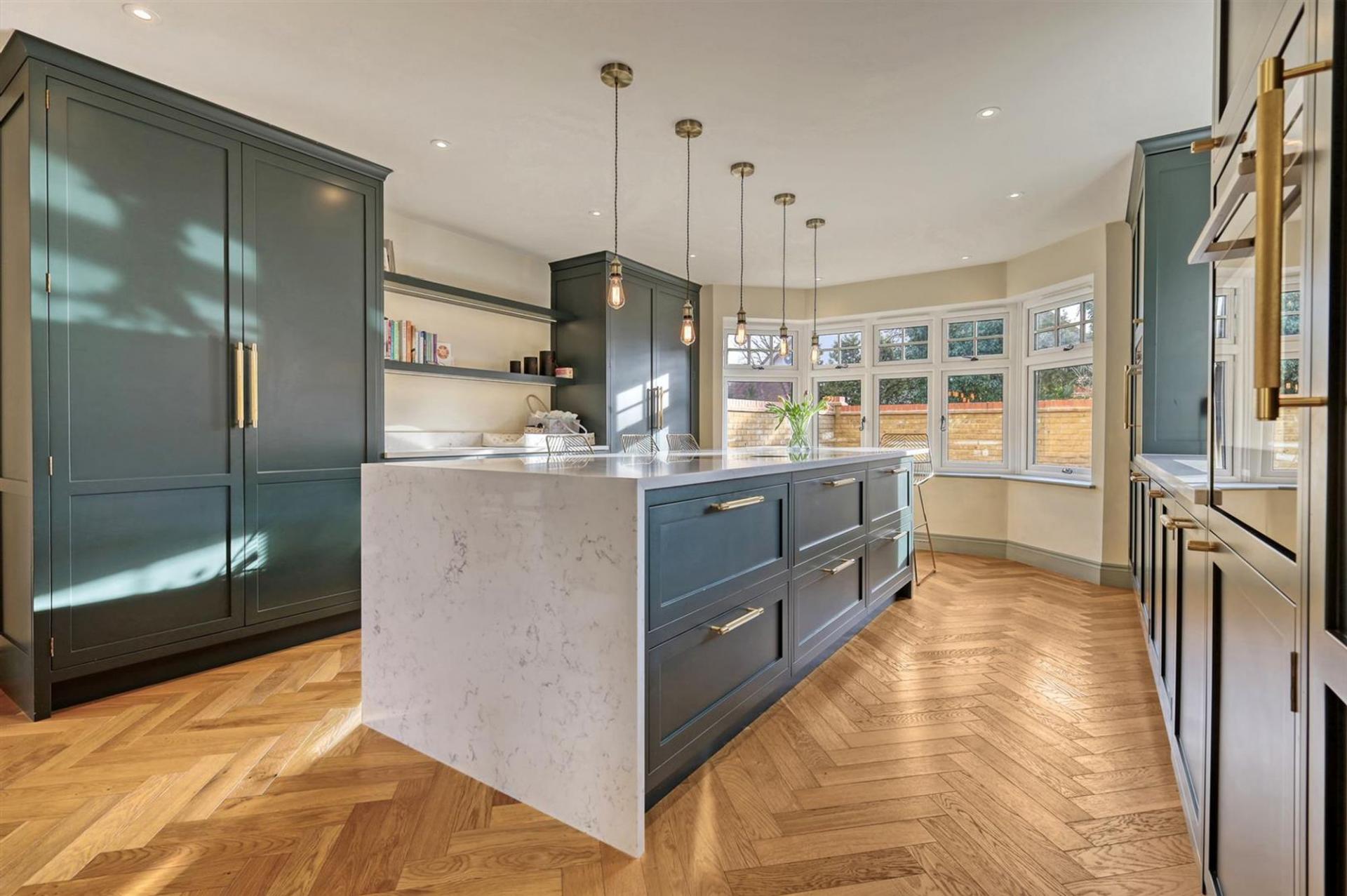 The heart of the home is the impressive designer kitchen, featuring dark cabinetry paired with oak drawers and shelves finished with dovetail detailing, complemented by premium Siemens appliances, a Bora hob, a wine fridge, and elegant pendant lighting. This space seamlessly flows into versatile open-plan areas, enhanced by stunning wooden herringbone flooring with zoned heating throughout the ground floor.