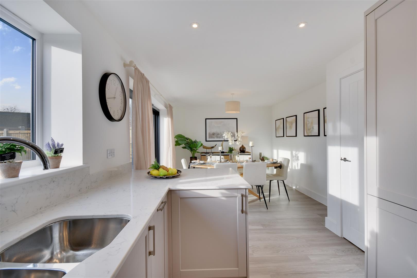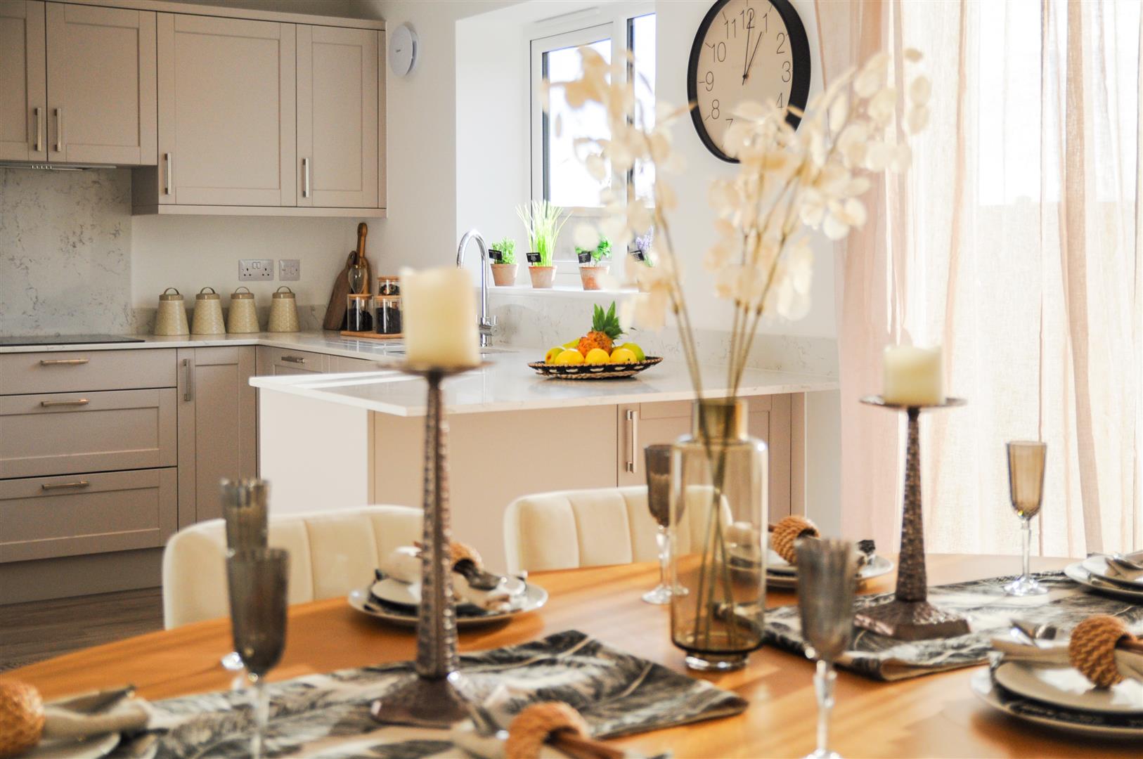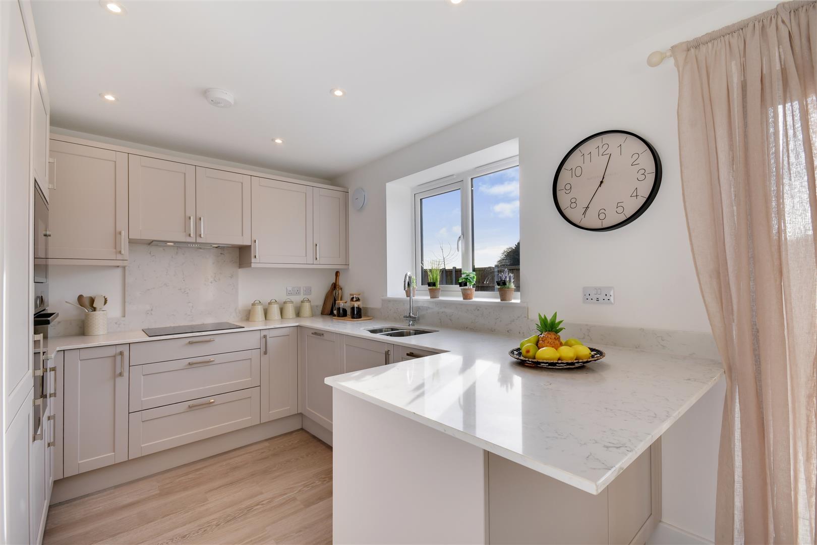 . Complementary light-coloured stone worktops and matching stone splashback