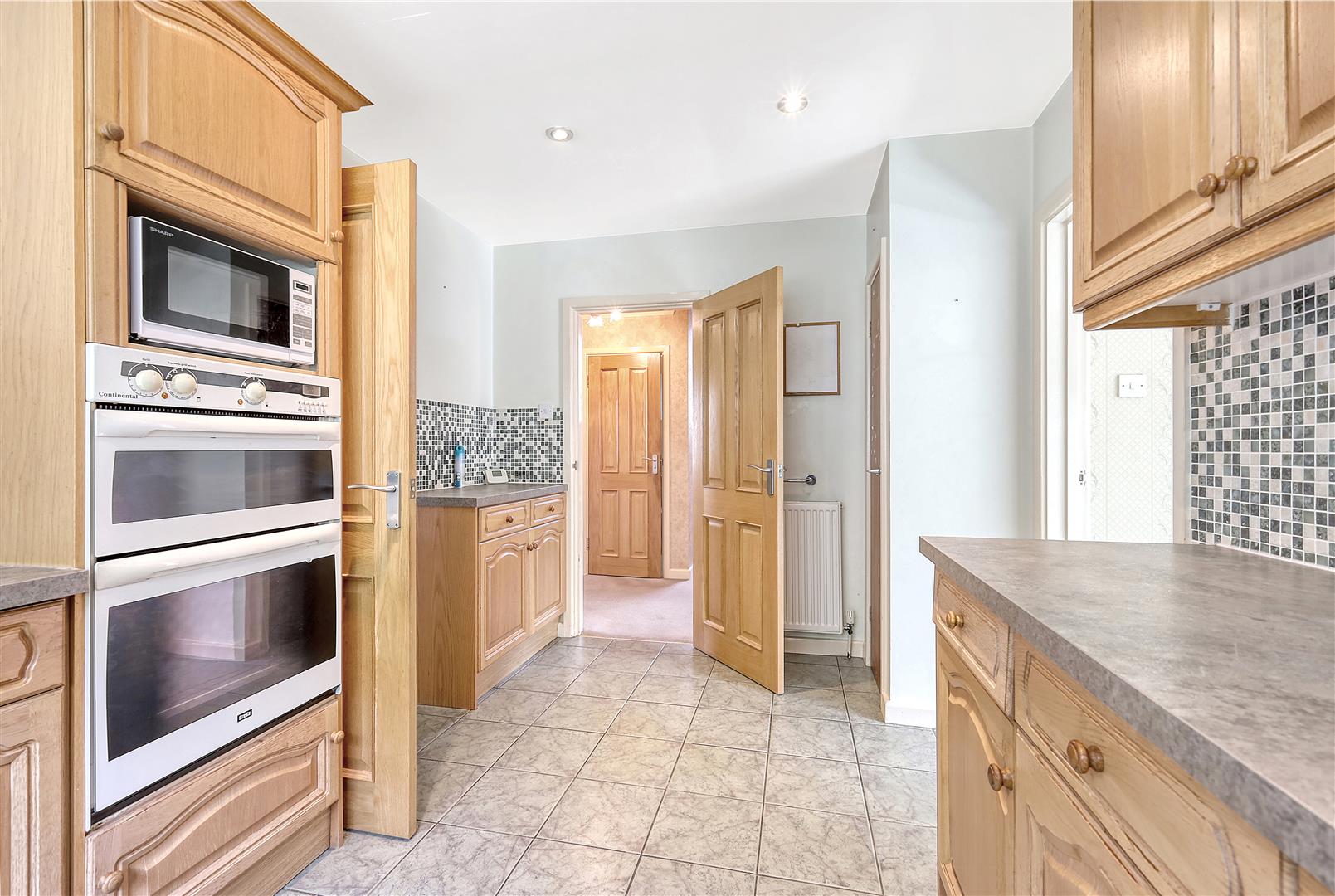 Kitchen - 4.52m x 2.82m (14'10 x 9'3) - Built-in storage cupboard. Wood effect wall and base units with double oven, microwave and electric hob. There is a door through to a separate utility room and further door through to a separate dining room.