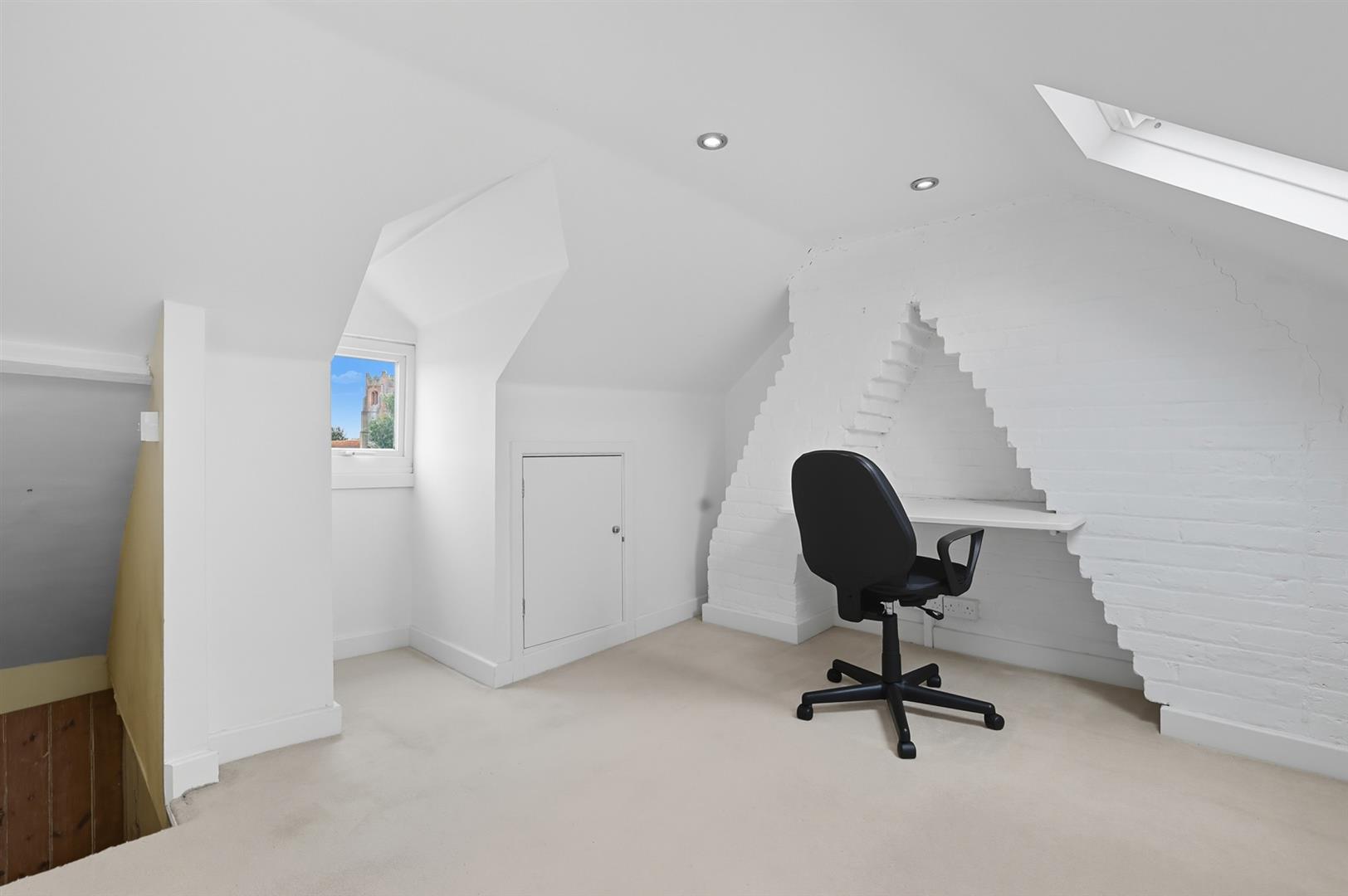 On the first floor, there are two well-proportioned bedrooms, both with built-in storage, while the top floor hosts a generous third double bedroom with vaulted ceilings, exposed brickwork and a bespoke study nook - ideal as a spacious home office.
