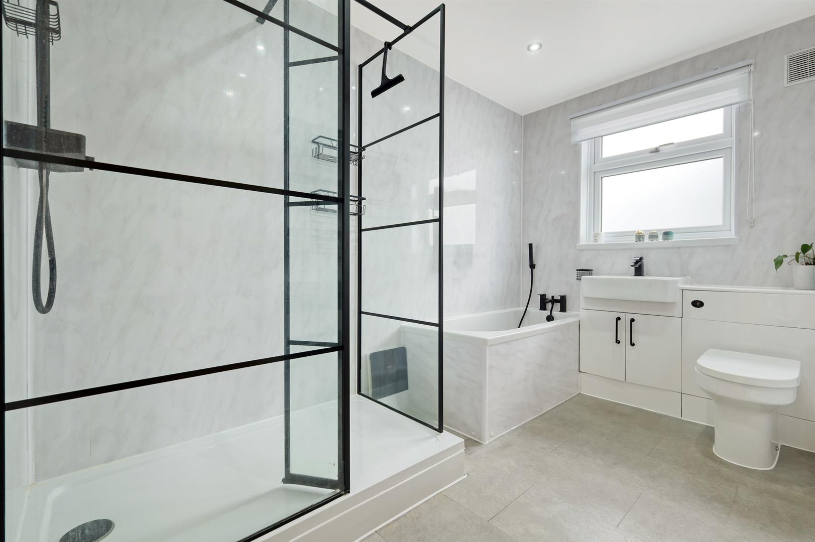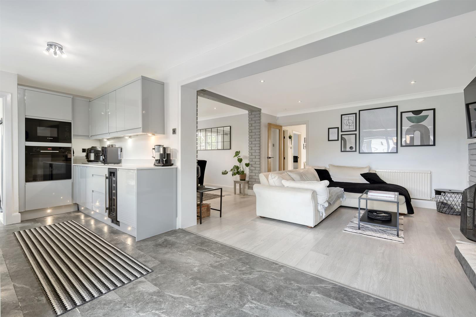 Positioned at the front of the property are the three well proportioned bedrooms, with a feature bay window to the principal. These are all served by the tastefully appointed family shower room. The rear of the property has been extended (single story) to provide a large open plan kitchen/dining area/lounge with open fireplace and sliding patio doors leading out to the rear garden. The kitchen comprises a range of above and below counter storage units, ample worktop space and various integrated appliances. There is also a further door providing access to the garden opposite the separate WC.