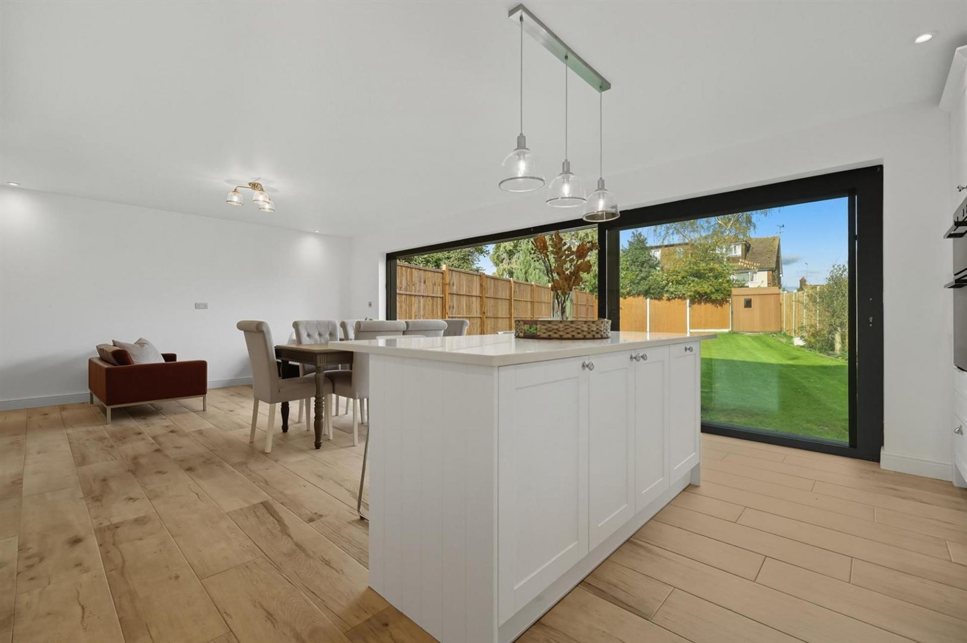 Thoughtfully extended to the rear, the heart of the home is the striking open-plan kitchen/dining space - an ideal setting for both family life and entertaining. Designed with style and function in mind, the kitchen features a central island with a breakfast bar with room for the whole family with views over the rear garden through the extensive sliding doors.