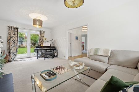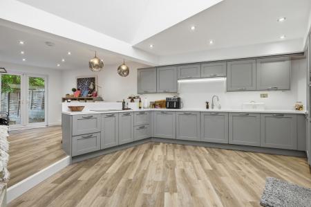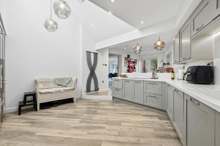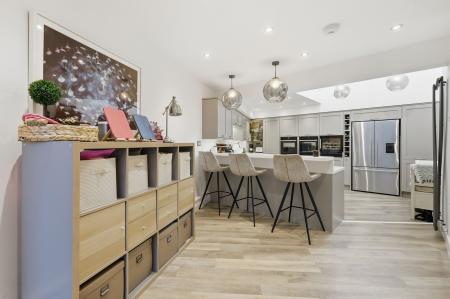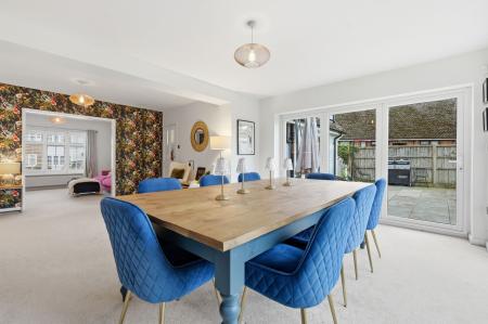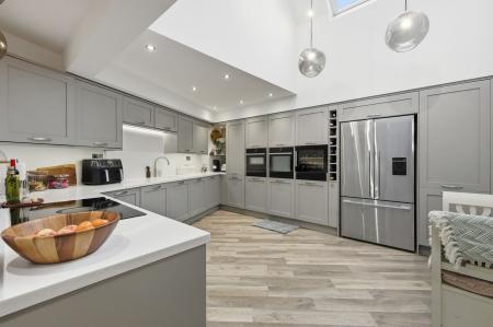 At the heart of the home is the kitchen/breakfast room - a bright, beautifully finished space with bespoke grey cabinetry, quartz worktops, integrated appliances, and extensive storage. Its open layout flows seamlessly into the generous dining room, which enjoys wonderful garden views through two sets of bi-fold doors.