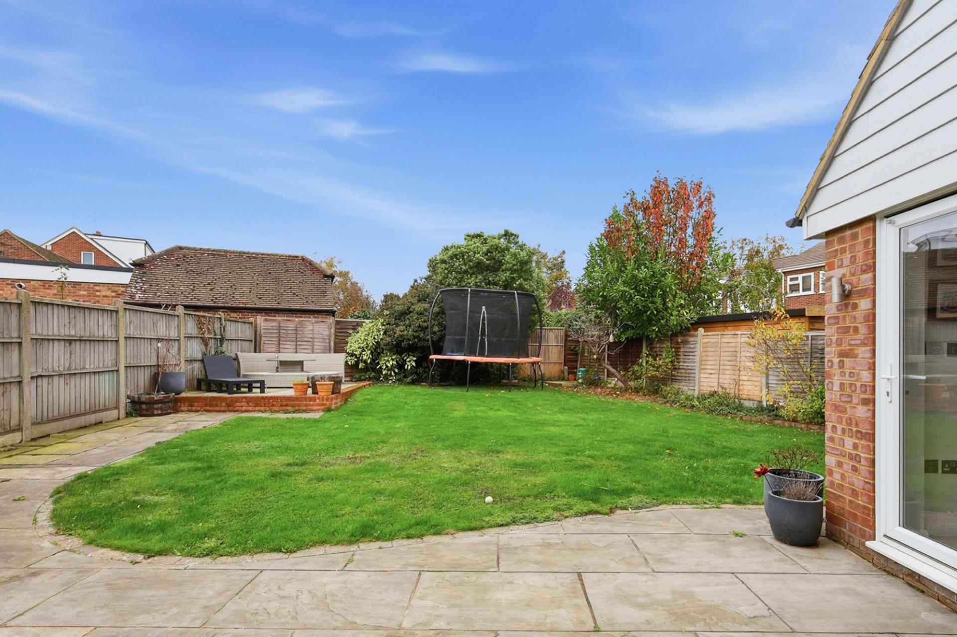 The rear garden is a private, family-friendly space with an attractive lawn, mature planting, and a paved patio perfect for outdoor dining and relaxation.