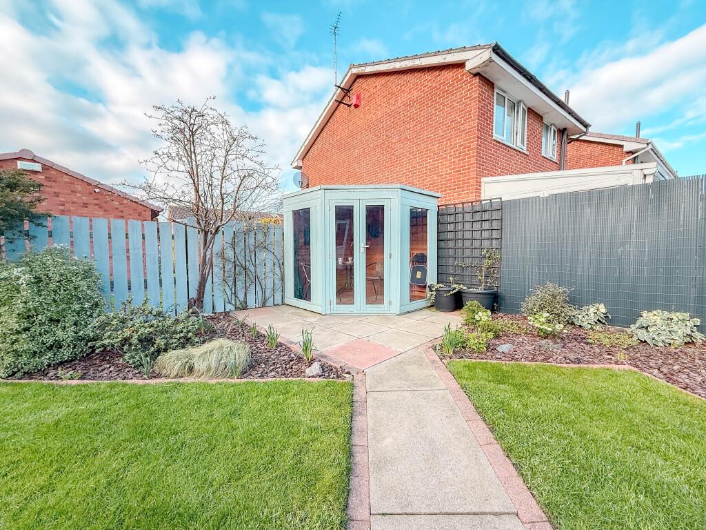 Outside, the property boasts a private, beautifully maintained rear garden, thoughtfully arranged with neat lawns, well established borders featuring a variety of mature and seasonal plants, decorative bark chippings, and a charming timber summer house, perfect for spending time outdoors.