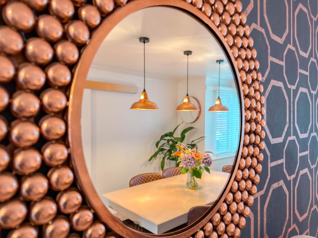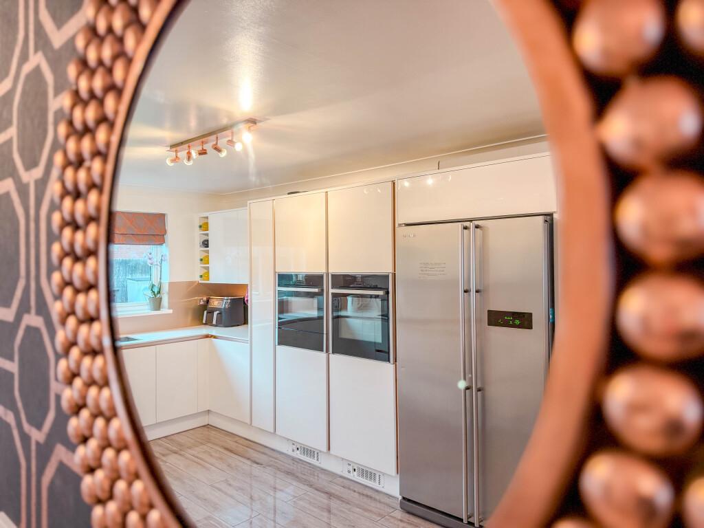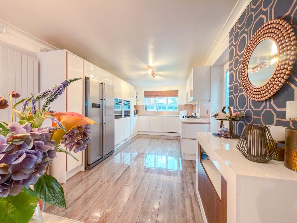 The kitchen and dining rooms have been opened up to create a generous, family-friendly kitchen diner spanning the full depth of the property. The kitchen is fitted with a range of sleek, contemporary gloss units with integrated cooking appliances and additional built-in appliances which includes a dishwasher and washing machine/ tumble . To the rear, a spacious lounge enjoys French patio doors opening directly onto the garden, while a convenient understairs WC completes the ground floor.
