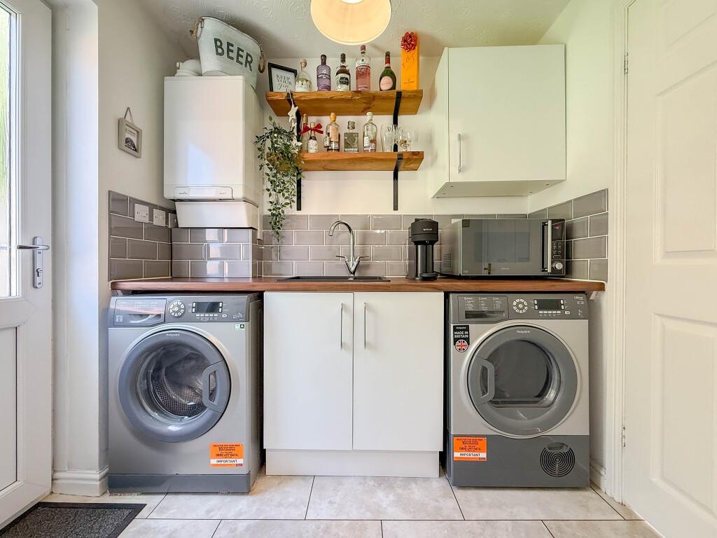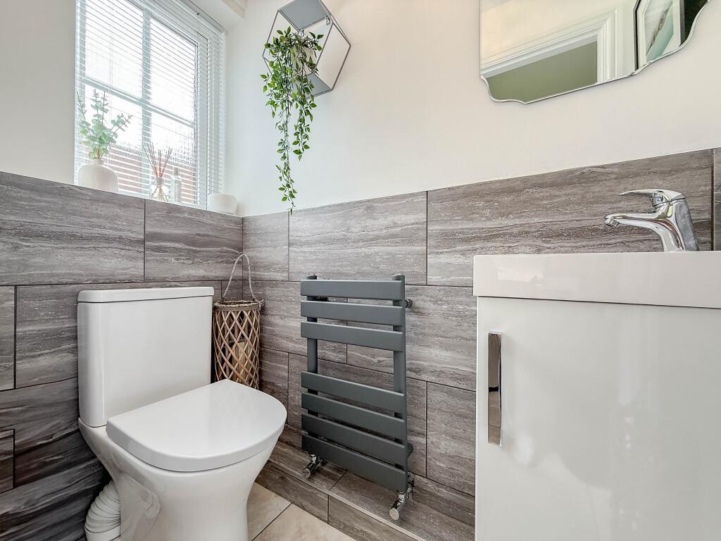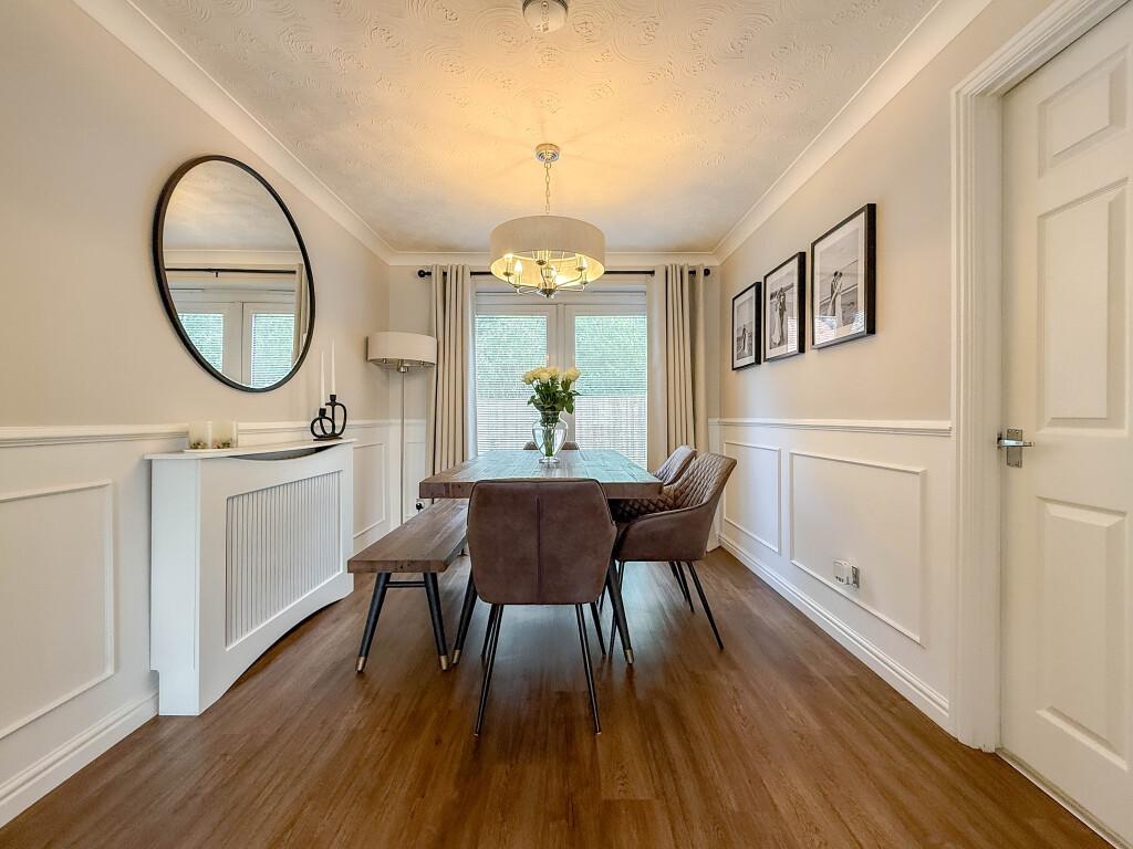 Beautifully presented throughout, the accommodation briefly comprises an entrance hall, a spacious bay-fronted lounge, and a dining room with French patio doors opening to the garden. The upgraded high-gloss kitchen features integrated appliances and is complemented by a utility room housing the wall-mounted combi boiler, along with a cloakroom/WC.