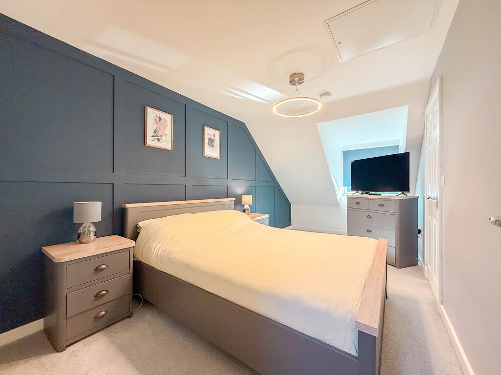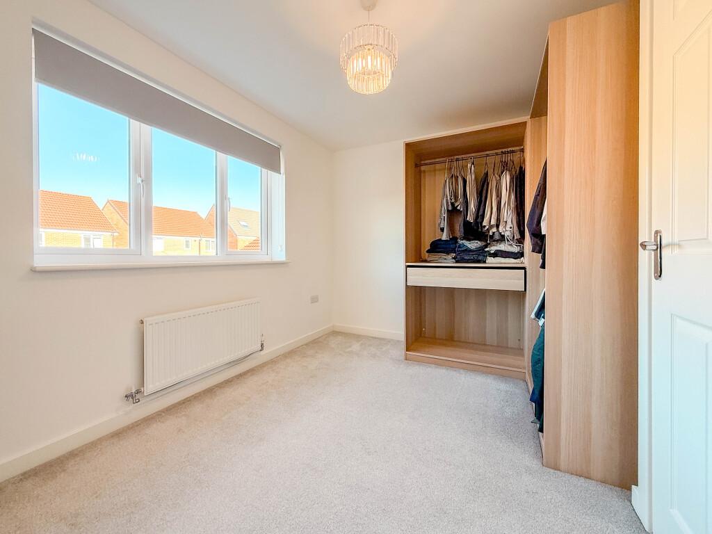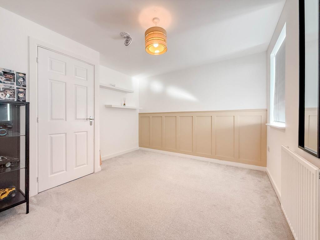 The second floor is dedicated to an impressive principal suite. A handy storage cupboard sits off the landing, and the large bedroom itself benefits from decorative wall panelling and its own part tiled shower room.