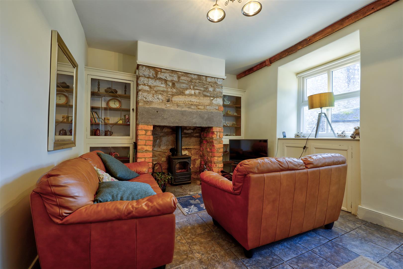 Living Room - 3.26m x 4.08m (10'8" x 13'5") - Inviting living room with timber part glazed external door and UPVC double glazed window to the front aspect. Stunning inglenook feature fireplace with log burning stove. 2 period feature display cabinets to each side of the fireplace. Exposed beam. Space for small table. Cupboard housing consumer unit. Tiled flooring. Access to: