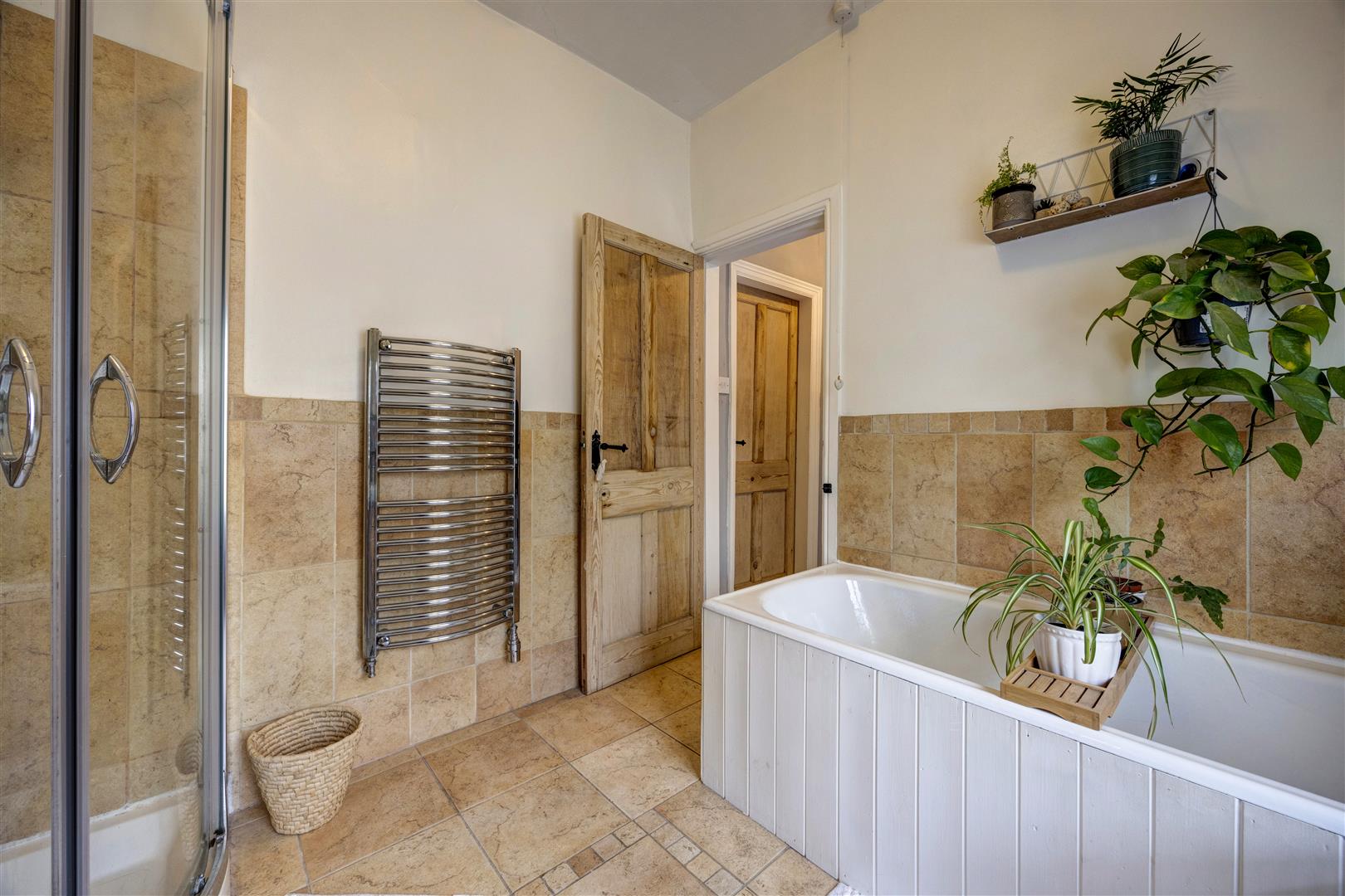 Bathroom - 2.46m x 2.64m (8'1" x 8'8") - Tiled flooring, heated towel rail, wash basin with vanity unit underneath, toilet, shower cubicle, bath, extractor fan, UPVC double glazed window with textured glass to rear aspect.