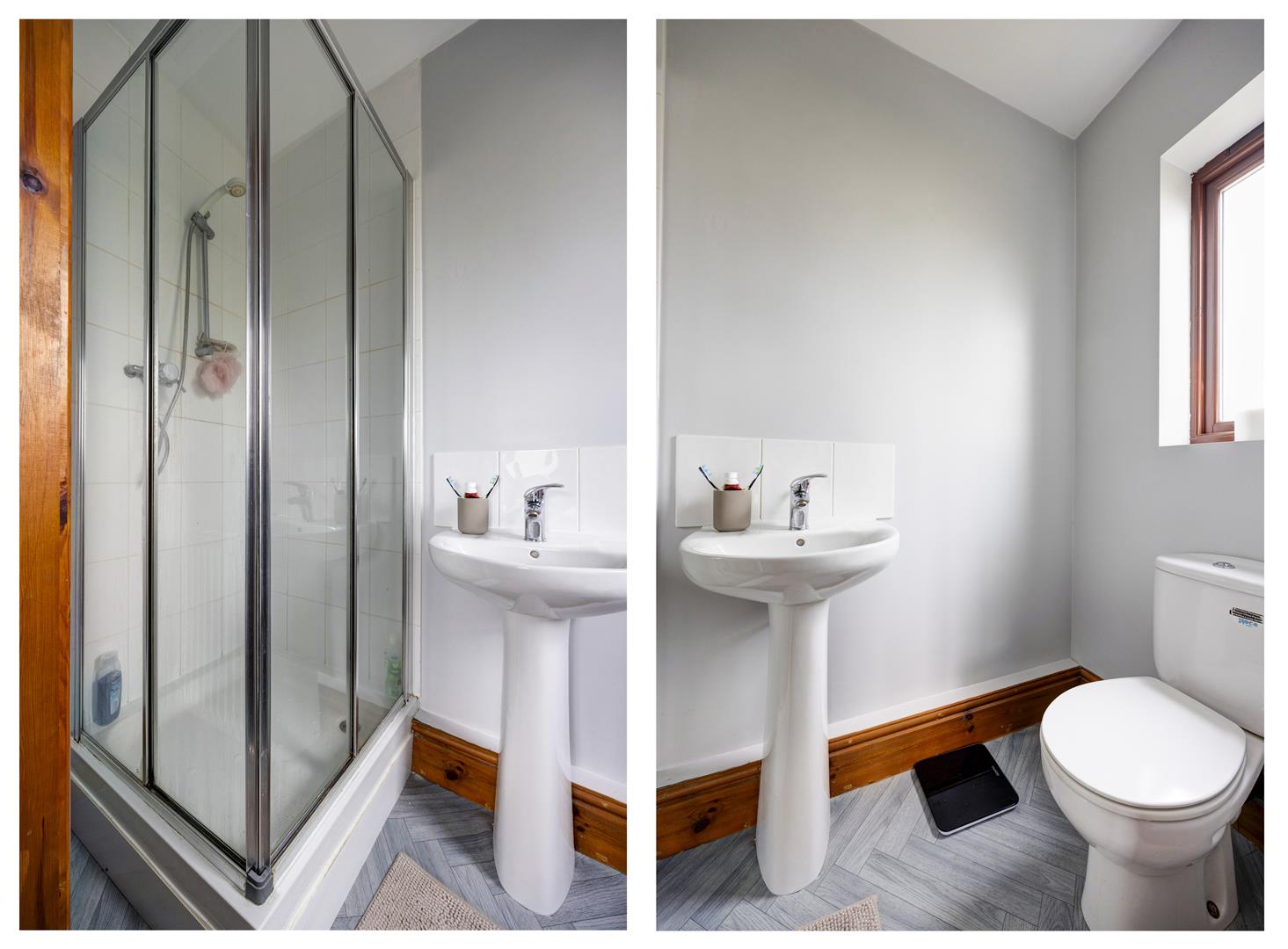 Ensuite - Wood laminate flooring, radiator, wash basin, toilet, shower cubicle, double glazed window with textured glass to rear aspect.