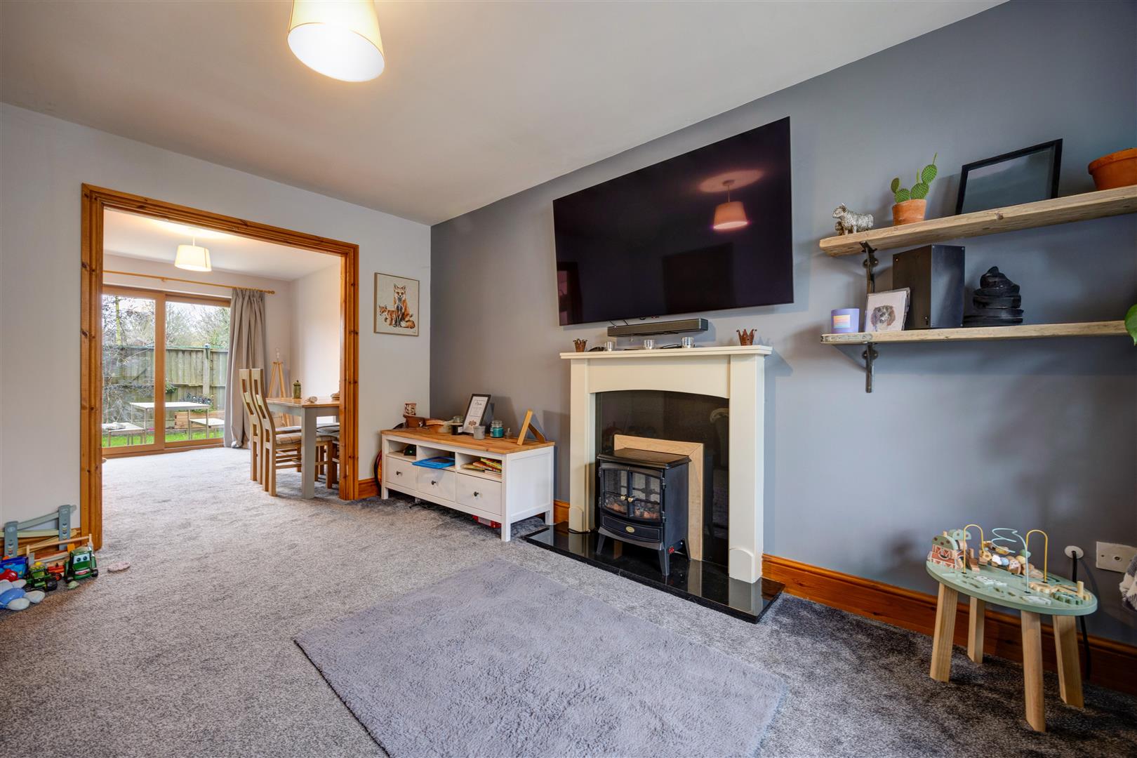 Sitting Room - Fitted carpet, radiator, decorative fireplace, fitted shelves, double glazed window to front aspect,