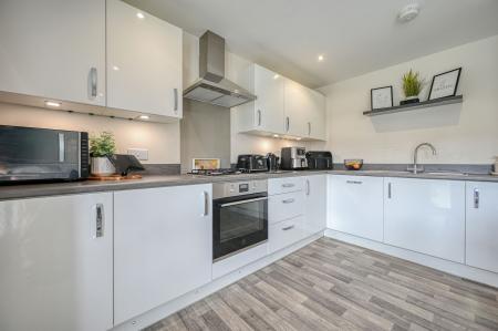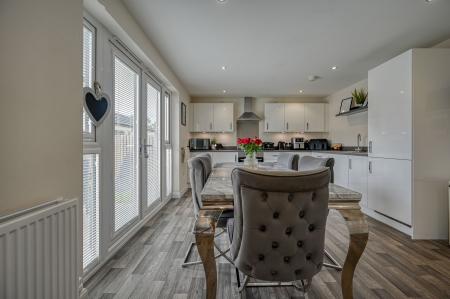 The welcoming hallway leads into a bright and inviting lounge, perfect for relaxing with family or entertaining guests. To the rear, the impressive kitchen/diner forms the heart of the home, with sleek cabinetry, ample workspace and a spacious dining area. French doors open directly onto the garden, creating a fantastic space for family meals or summer gatherings. A useful utility room and a modern WC complete the ground floor.