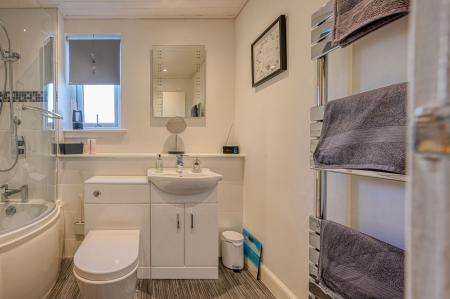 Upstairs, there are two double bedrooms, each with fitted storage, plus a stylish modern bathroom featuring a fresh white suite, shower over bath, and a sleek vanity unit with built-in storage.