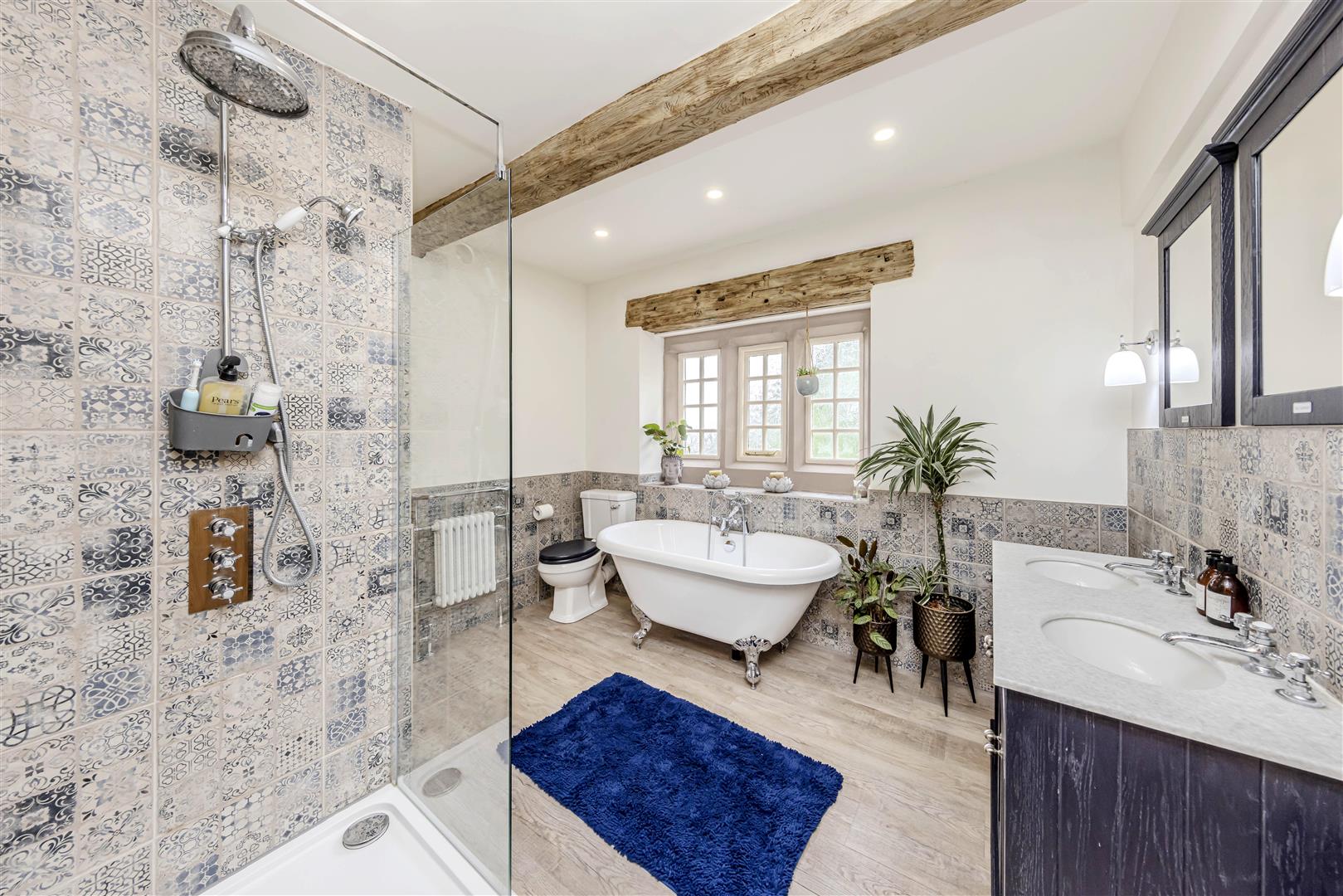 Family Bathroom - A luxury fitted bathroom with roll top freestanding bath, clawed feet, central tap and shower attachment, his and her vanity sink units with storage under and two fitted wall mirrors over, wall lights, walk in shower cubicle with shower head and attachment, wooden exposed designed flooring, W.C. part tiled walls, windows to the rear with exposed beam over, exposed beamed ceiling, storage cupboard, heritage style radiator with towel rail.