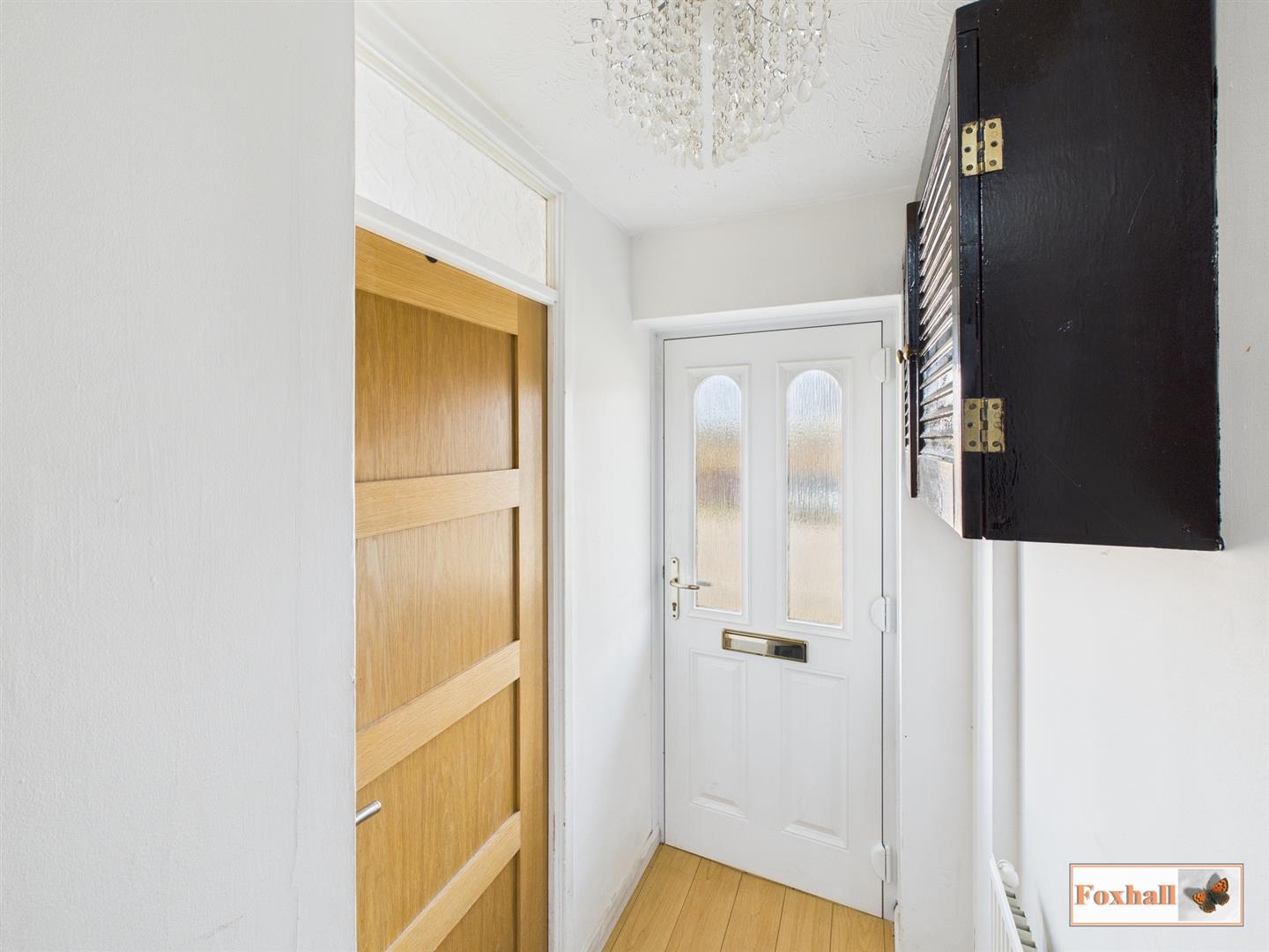 Entrance Hallway - Double glazed door with obscured window panels, laminate flooring, radiator, stairs up to the first floor, door to the lounge, cupboard housing the electric fuse board.