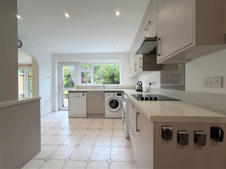 KITCHEN 11' 4" narrowing to 8' 1" max. x 21' 3" narrowing to 9' 1" max. approx (3.45m x 6.48m) Double glazed window to rear, radiator, two electric plinth level heaters, a comprehensive range of modern base and eye level cupboard and drawer fitted units with integrated corner carousel, quartz effect work surfaces with matching uprights, inset ceramic sink drainer unit with mixer tap, built-in NEFF oven and grill with plate warming drawer, inset NEFF electric hob with extractor over, space for fridge-freezer, Bosch washing machine, tumble dryer and dish-washer appliances to remain, two built-in storage cupboards, tiled floor, inset LED lighting, double glazed door opening to rear garden, opening through to sitting/dining room.