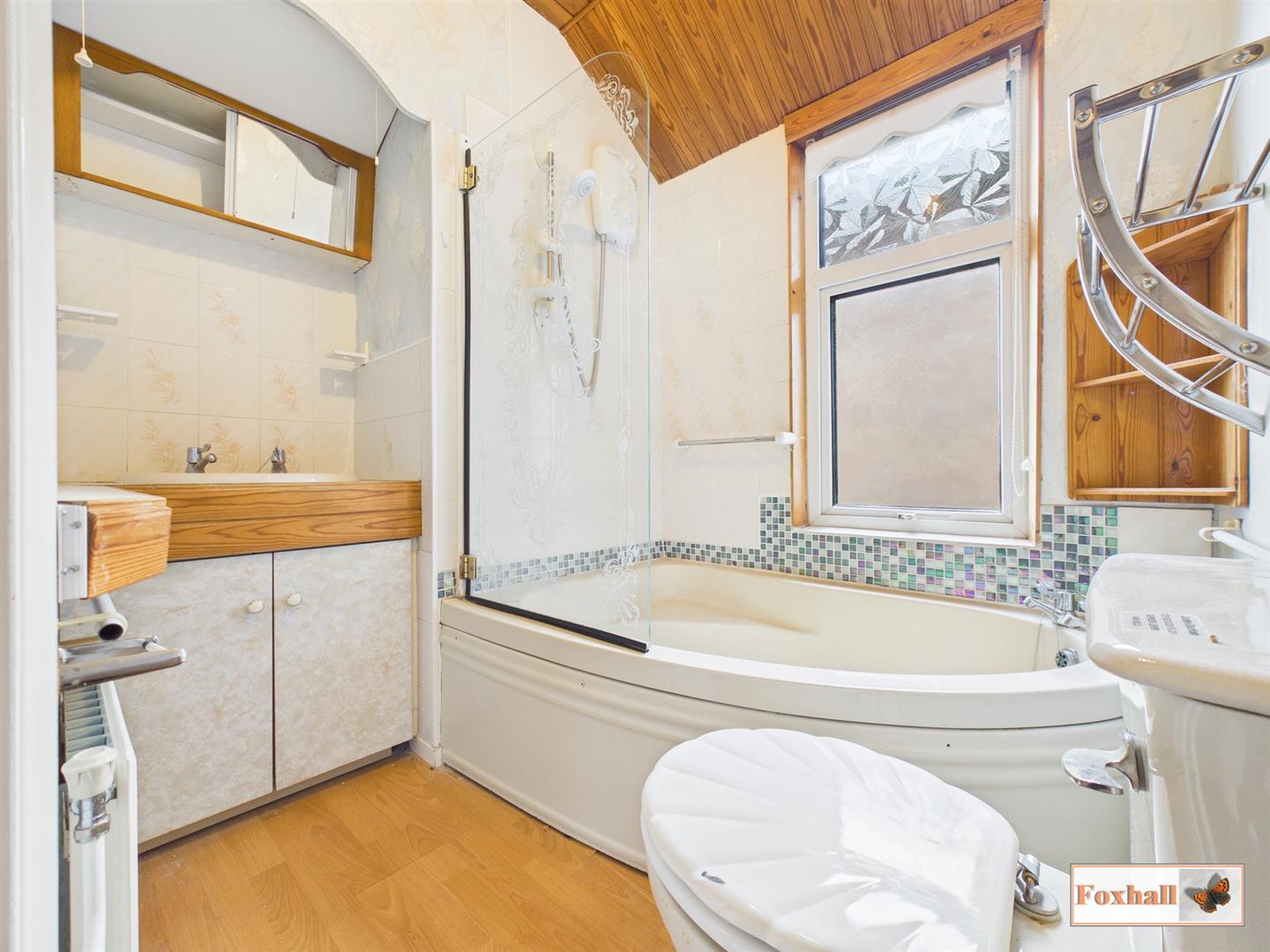 Bathroom - 1.75 x 1.62 (5'8" x 5'3") - Corner bath with Galaxy Mystique electric shower over, hand wash basin into vanity unit, low-level W.C., radiator, laminate flooring and side aspect frosted double glazed window.