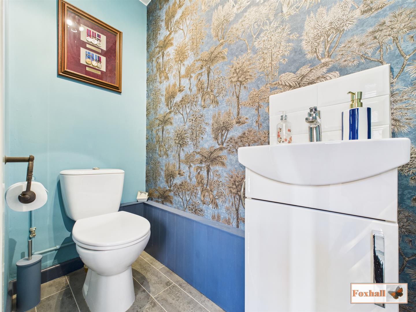 Downstairs W.C. - Low-level W.C., hand wash basin into vanity unit with tiled splashback, stainless steel towel rail and laminate flooring.