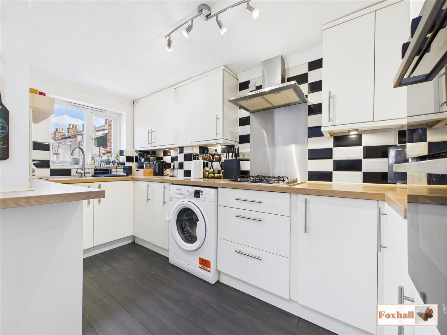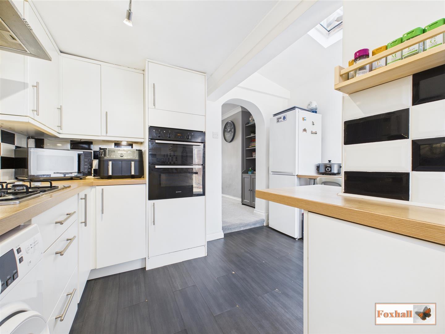 Kitchen/Breakfast Room - 3.63m x 3.53m (11'11" x 11'7") - Double glazed window to the rear, two skylights, breakfast bar that seats three comfortably, space for a fridge, wall and base units with cupboards and drawers, built in oven and grill, four ring stainless steel gas hob with a cooker hood above with stainless steel splashback, space and plumbing for a washing machine, stainless steel single sink bowl and drainer unit, tiled splashback, coving, laminate flooring and a radiator