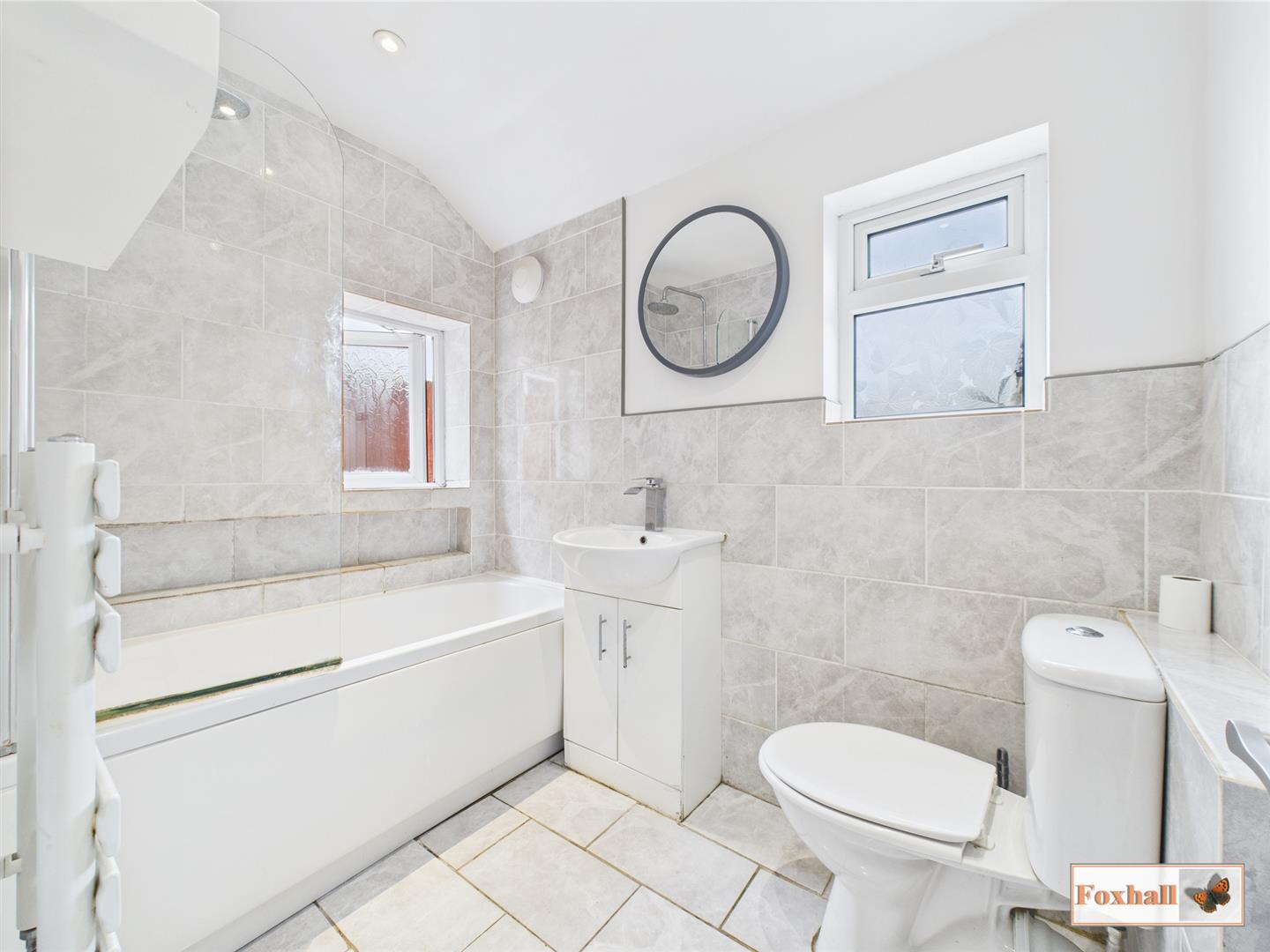 Bathroom - Double glazed obscure window to the side and rear, spotlights, extractor fan, panel bath with mixer taps and a shower attachment over, low flush W.C., vanity wash hand basin with a mixer tap, heated towel rail, half tiled walls and tiled flooring.