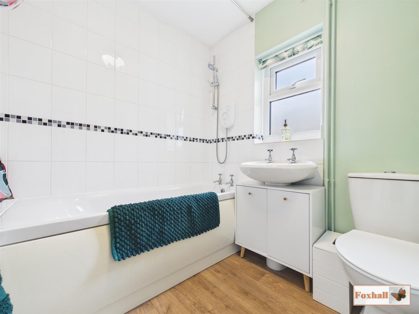 Bathroom - 1.93m x 1.83m (6'4 x 6) - Panelled bath with Triton T70xr electric shower over, low level W.C., pedestal hand wash basin, radiator, side aspect frosted double glazed window, laminate flooring.