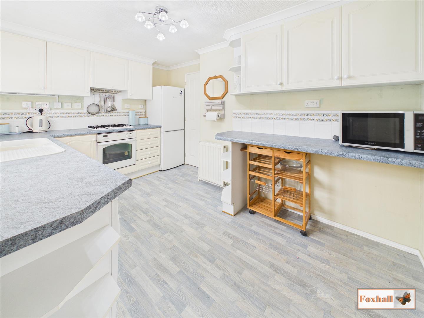 Kitchen/Breakfast Room - 4.55m x 2.36m (14'11" x 7'9") - UPVC double glazed window to side, single drainer sink with a mixer tap inset into a roll-edged worksurface with cupboards and drawers under and matching above, space and plumbing for a washing machine, built-in oven, built-in hob with extractor hood over, space for a fridge freezer, radiator, breakfast bar, wood effect vinyl flooring, coved ceiling, tiled splash-backs, storage cupboard and a further cupboard housing a Worcester combi LPG boiler.