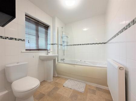 BATHROOM Obscure double glazed window to rear, radiator, panel bath with mixer tap, thermostatic shower and side screen, pedestal hand-wash basin with mixer tap, low level WC, fully tiled walls, shaver socket, vinyl tile effect flooring, extractor fan.