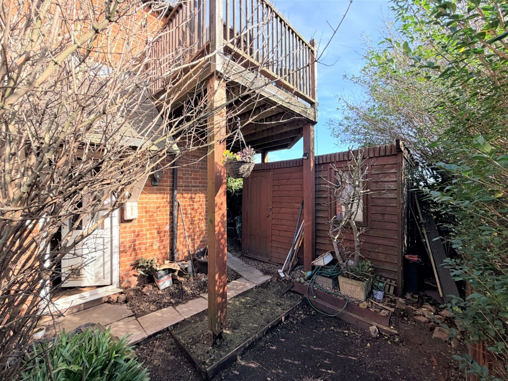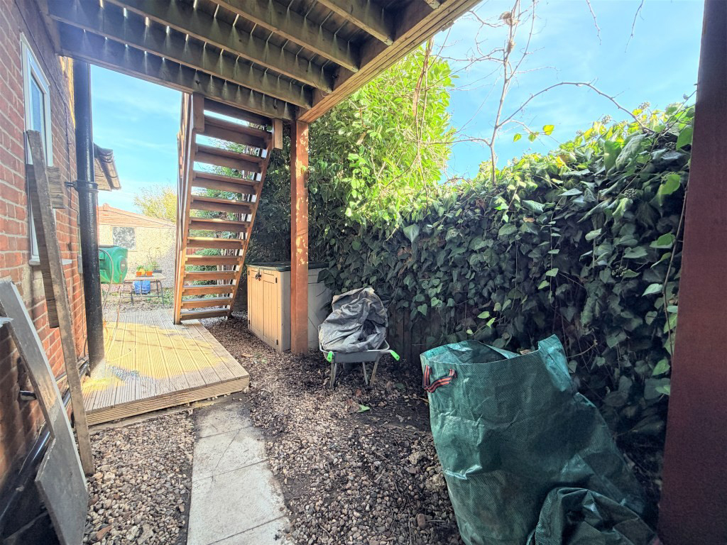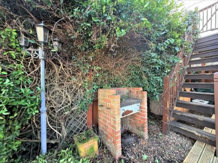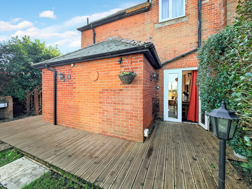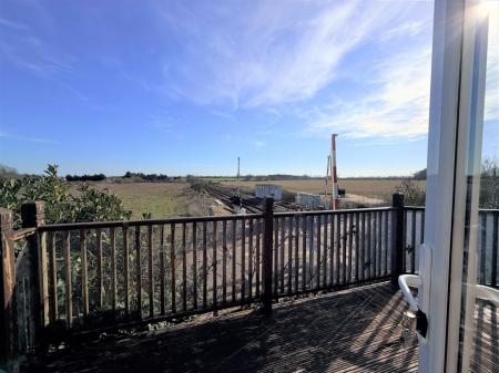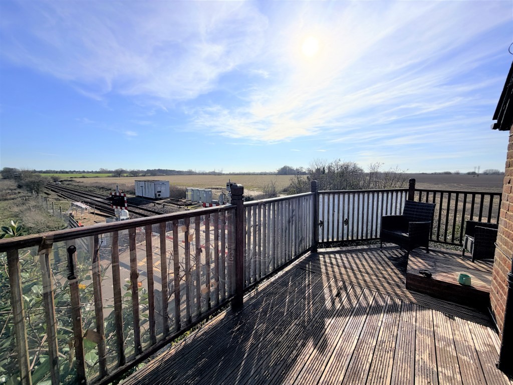 OUTSIDE A detached garage with side shingle driveway providing off-road parking leads to and reveals an attractive gated wrap around garden with lawn area, decking platform and shingle seating area, there is a brick built barbecue, pathways, wooden shed, mains power and tap. A picket fence and hedging borders the railway line, and stairs rise to the elevated entertainment terrace which enjoys far reaching views over the level crossing and across beautiful Suffolk countryside. Beside the garage is a plastic oil tank which can hold approximately 800 litres of oil, across the road is access to the sceptic tank which is to 2020 required standards.